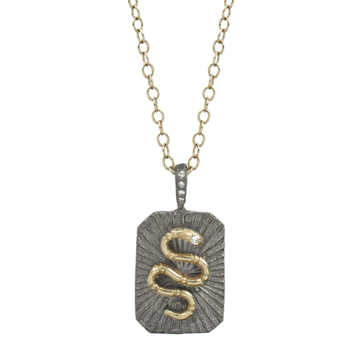 Symbolizing "renewal", the snake charm shines beautifully on a burst of textured silver. The tag charm is completed with a diamond as the snake's eye and diamonds in the bail. Layer this sweet necklace, or add new symbolism to your charm holder; these are made to mix, match, and layer up. Let your amulet remind you of what you hold close to your heart.