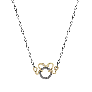 14k gold snakes with diamond eyes coil around an antiqued silver charm ring and hang from a petite antiqued silver paperclip chain. This charm holder is ideal for a collection of dainty charms.