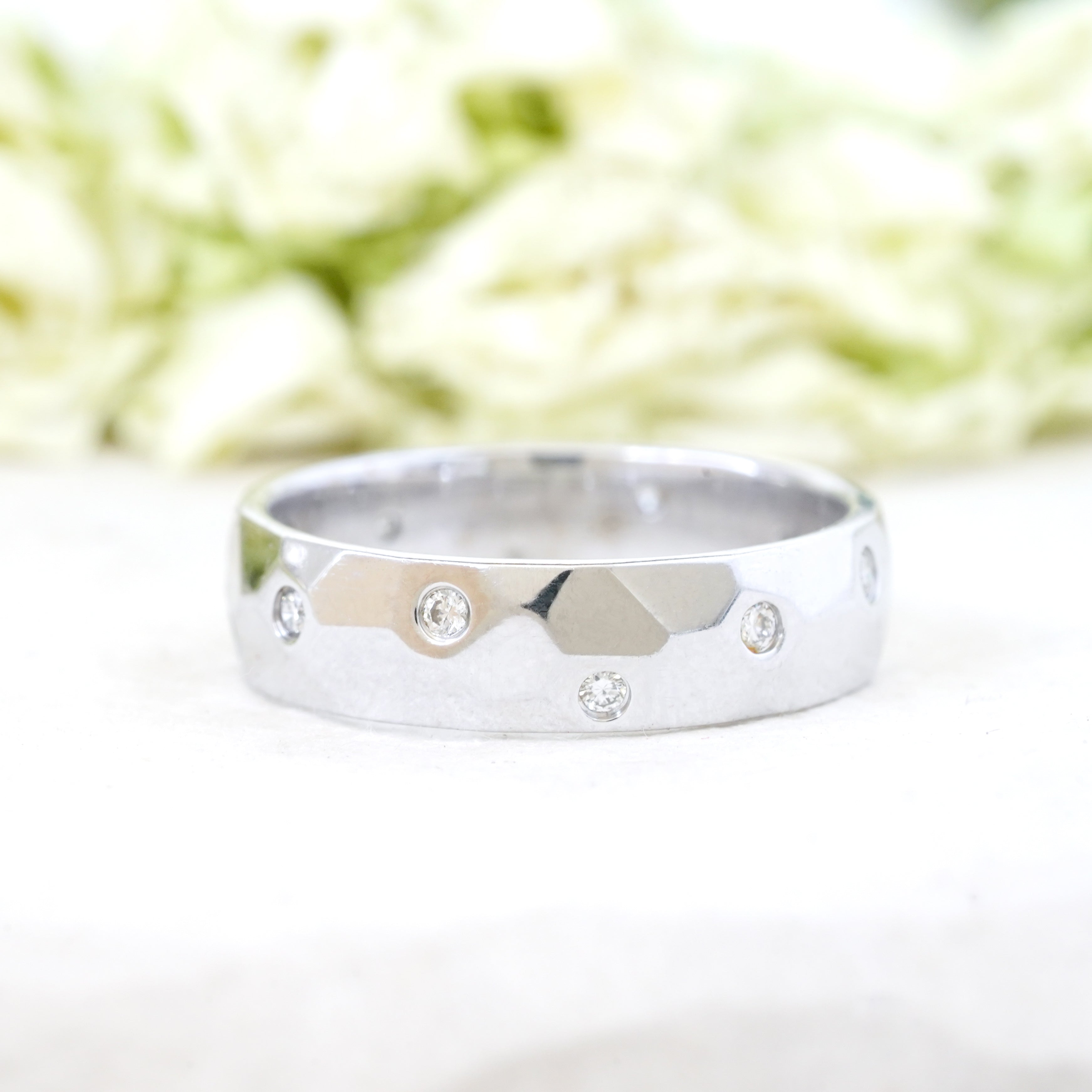 Our Artifex wide band (5mm width) has been reimagined with natural diamonds placed organically around their faceted surfaces. These aren’t your typical diamond bands: the stones are nestled within geometric facets, giving them a sense of hidden glimmer.