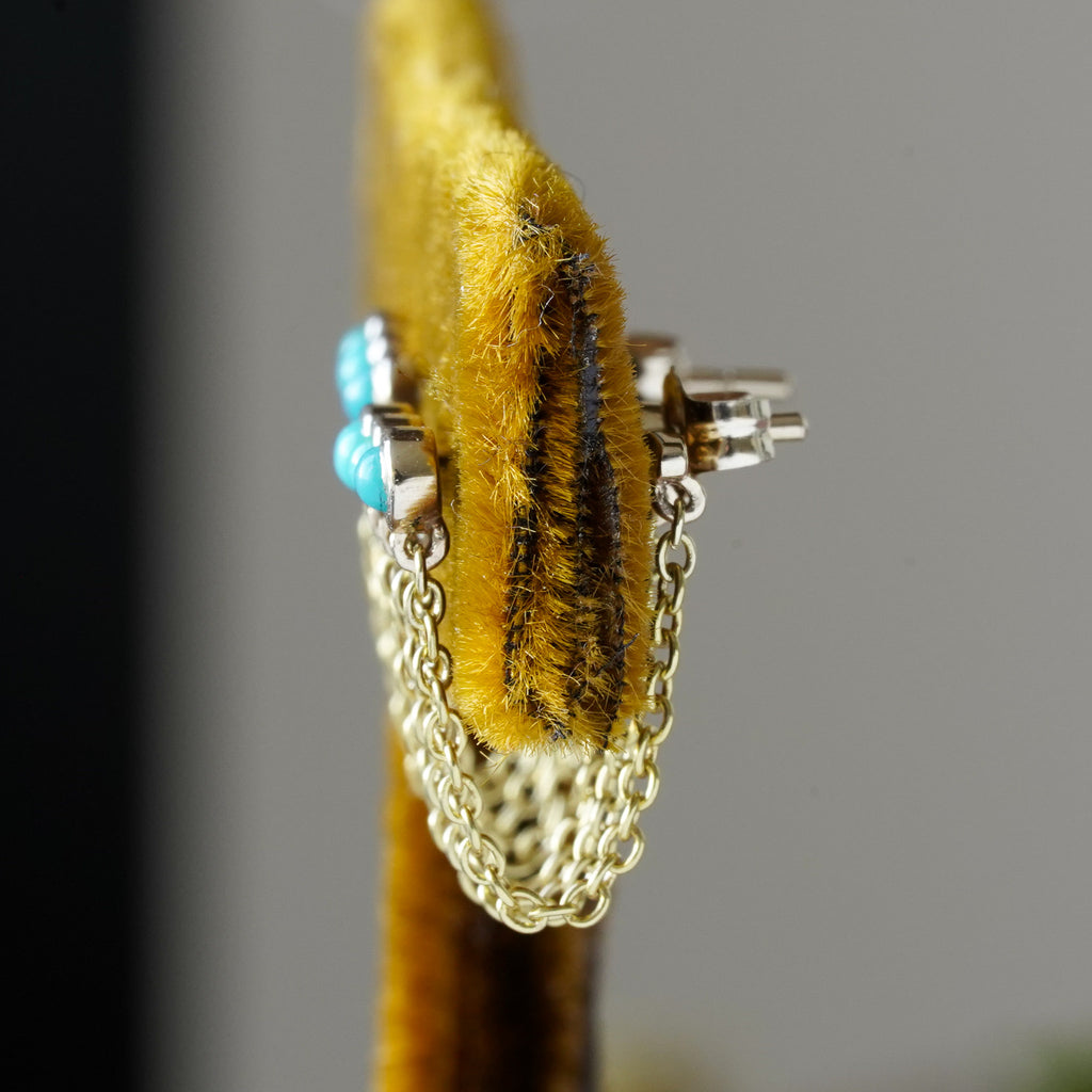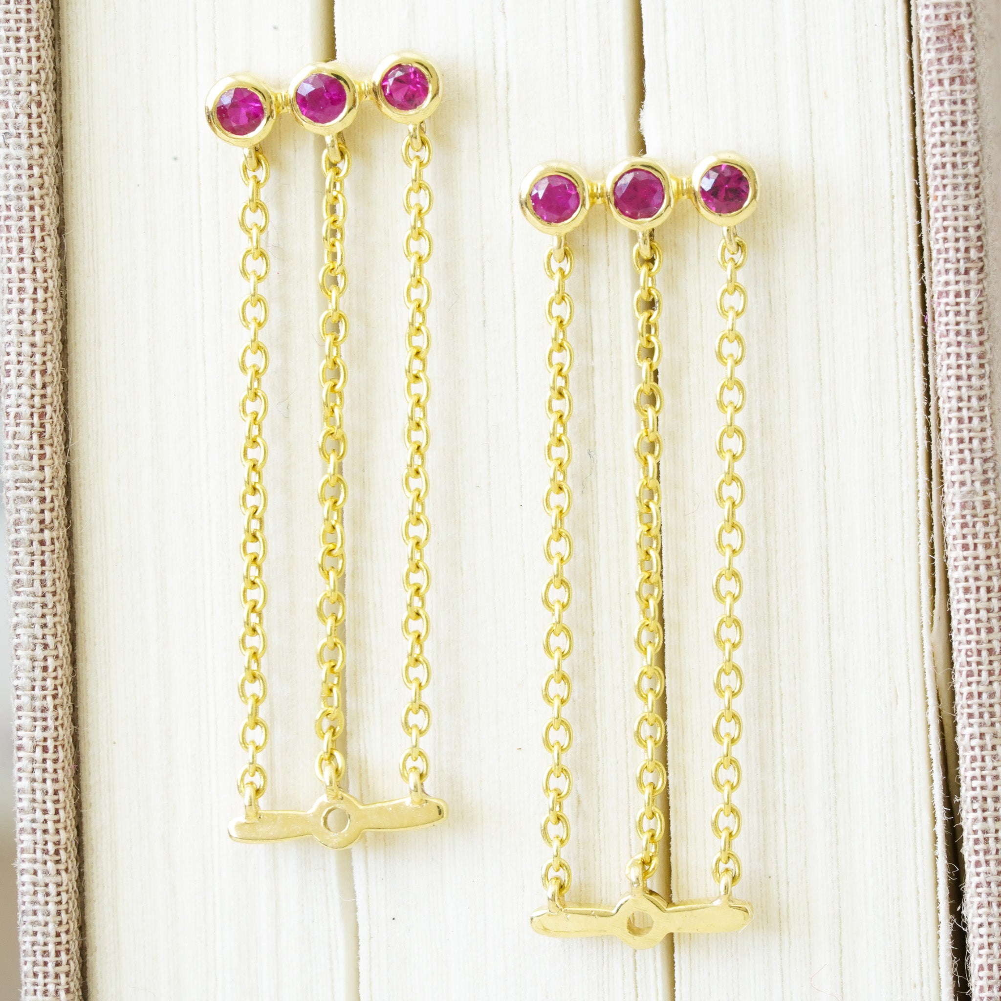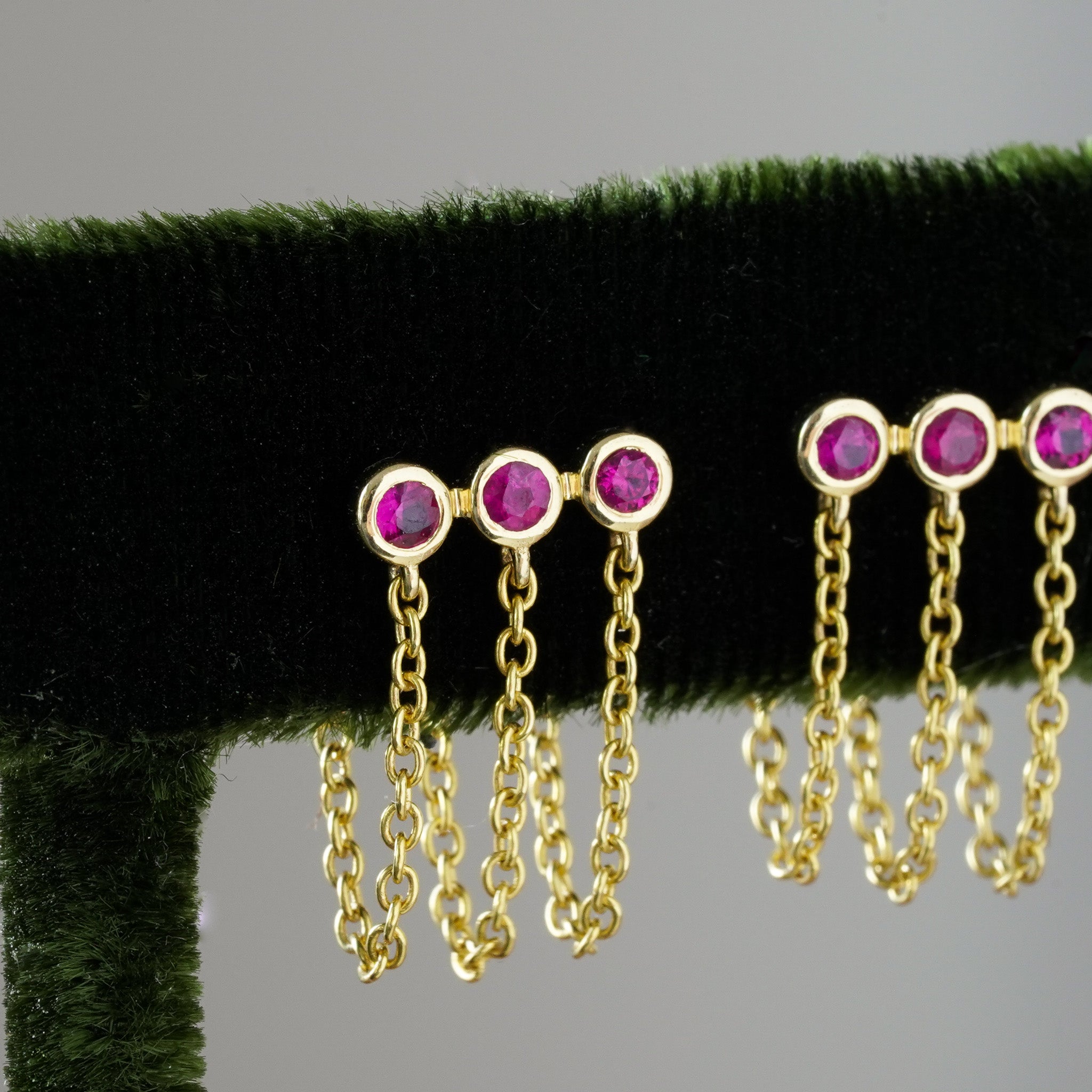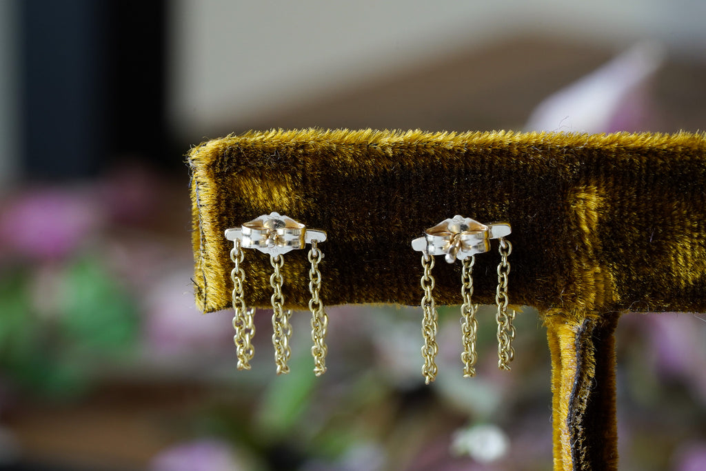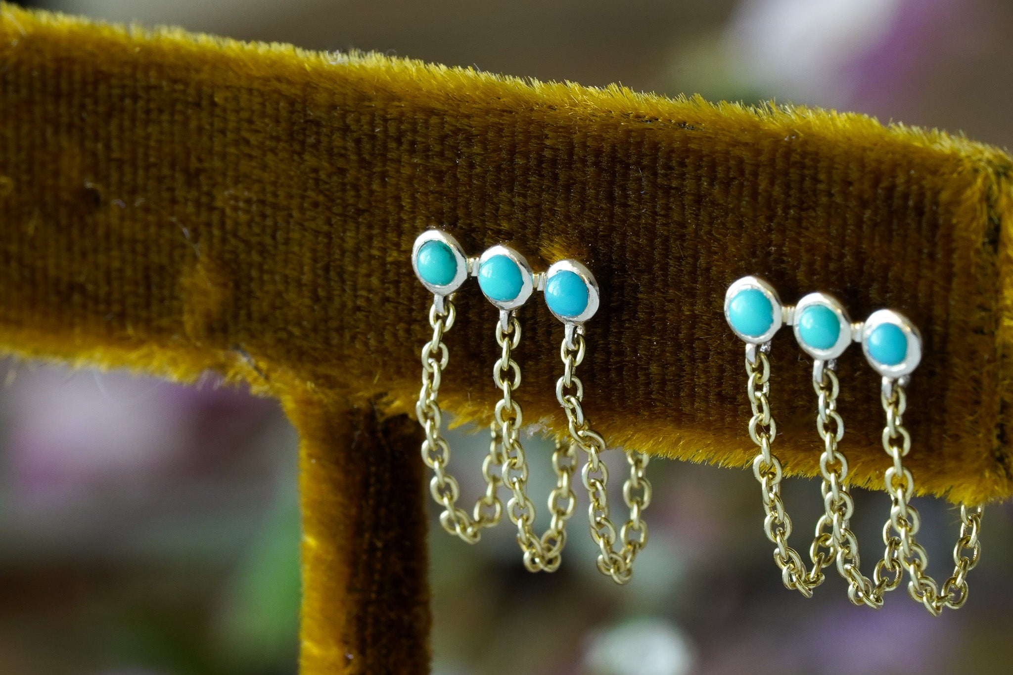 Three gold chains hang from three stones and are made to go behind the ear to be secured with an ear back. Very unique and ultra eye catching, they will become your favorite new style. The front of these solid 14k yellow gold studs measure 3/8" across.