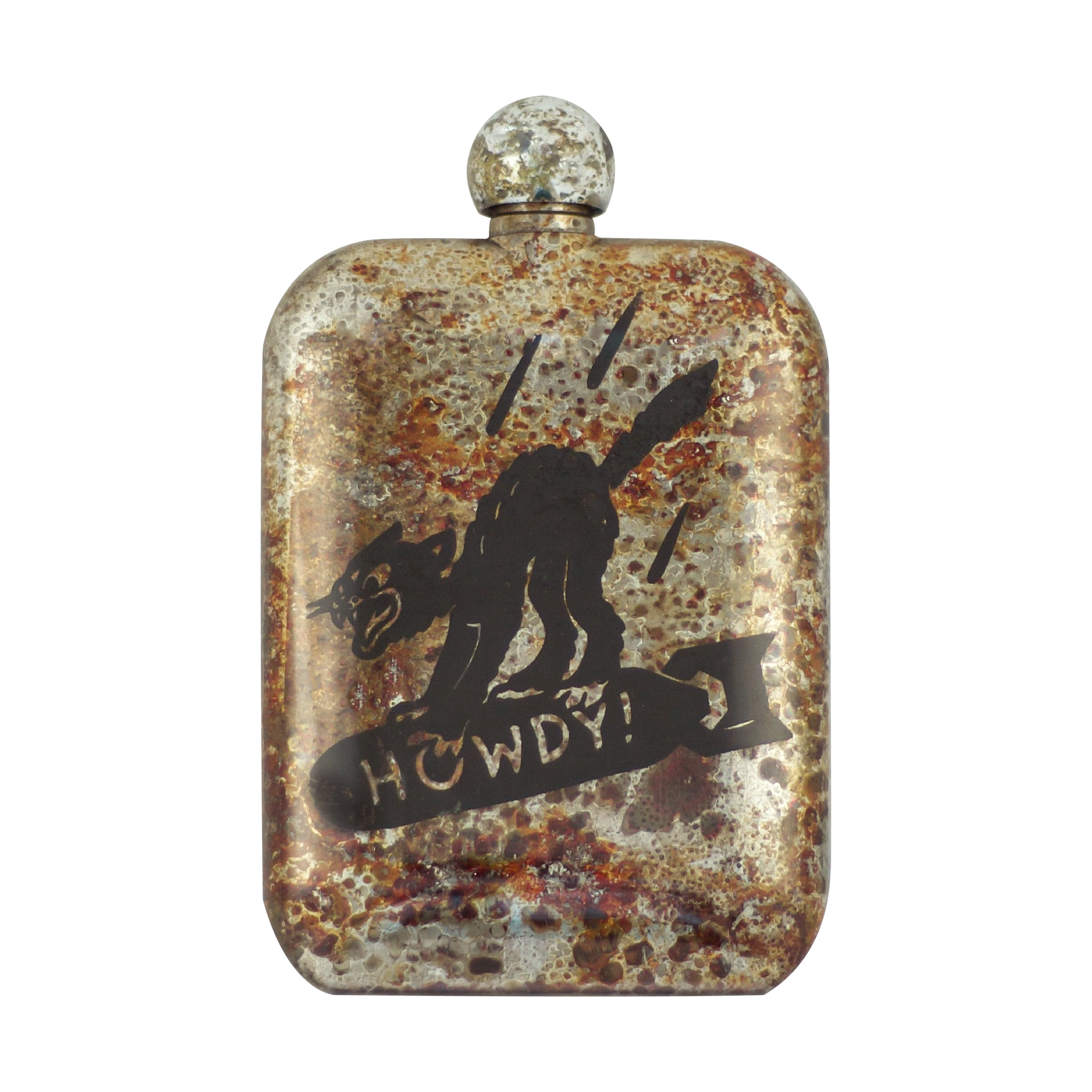 6 oz stainless steel with etched embellishments atop their classic patina. Shipped in a printed cloth bag.