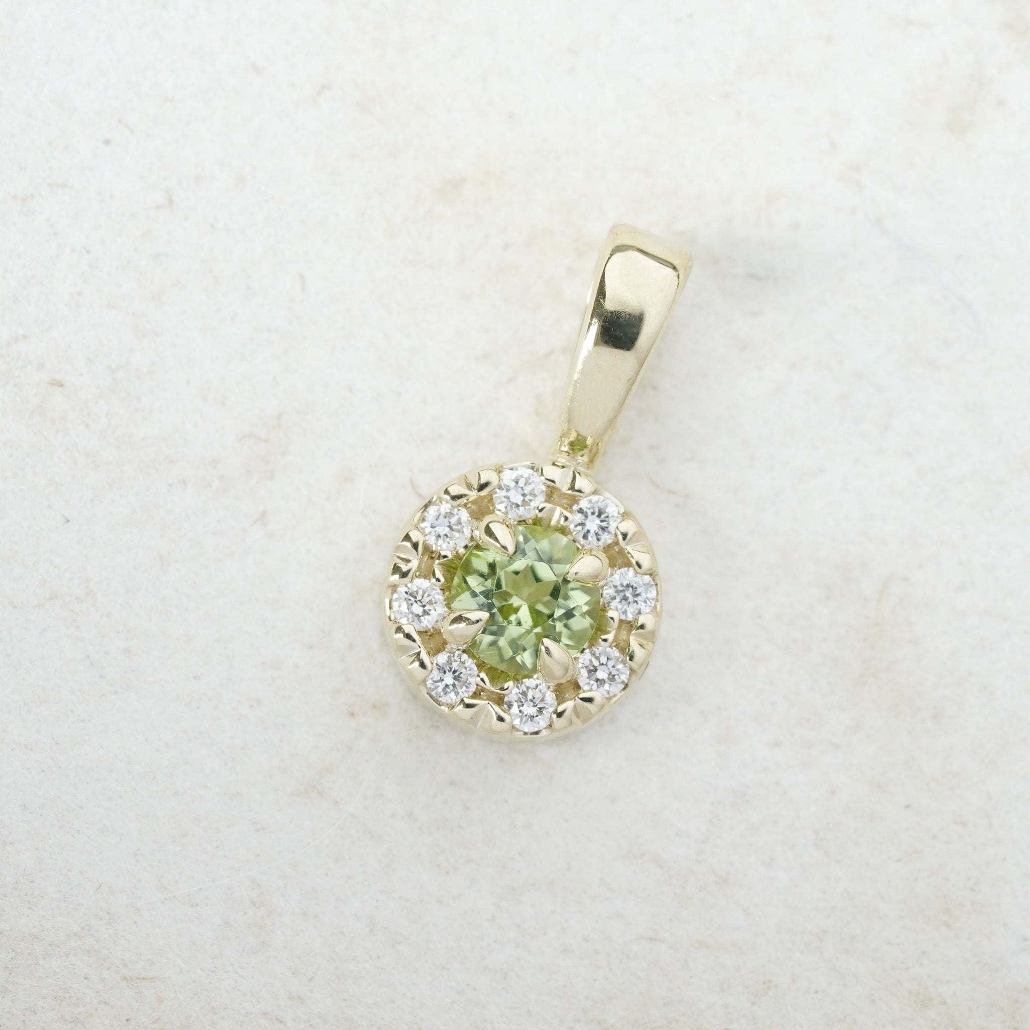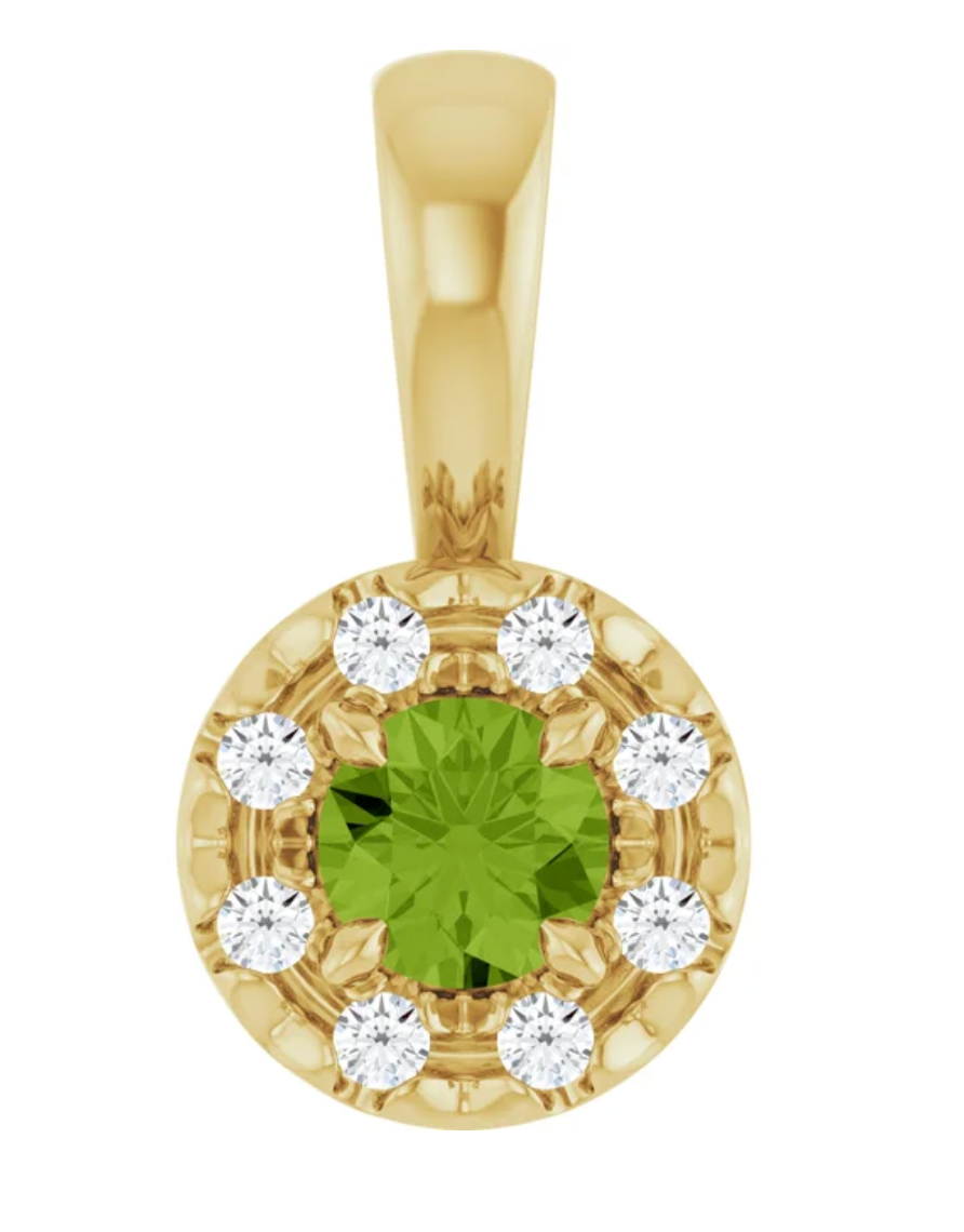 This pendant features a halo of natural diamonds encircling a sparkling peridot all set in 14k yellow gold.