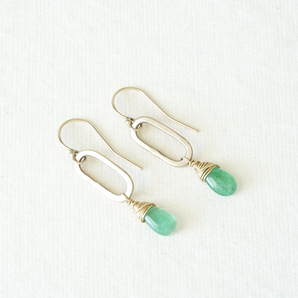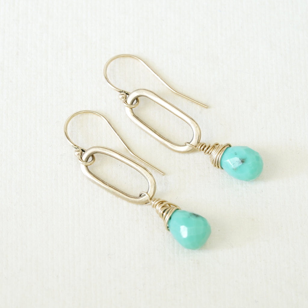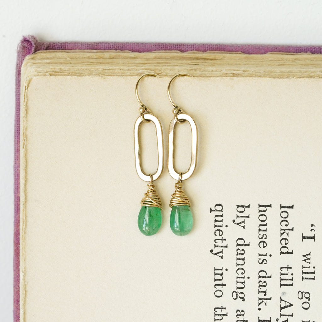 A single handmade link is hammered flat and hung with a stone wrapped in 14k wire. All parts of these earrings are 14k yellow gold, including the wire that holds the turquoise or emerald drops.