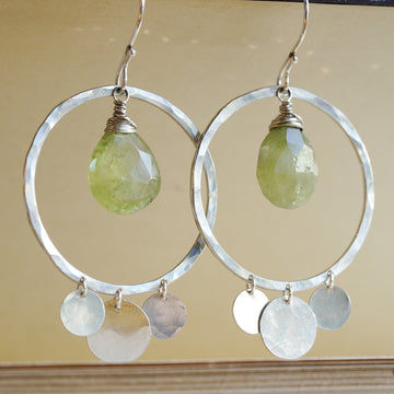 Sterling silver disks adorn a matching hoop, with a stone suspended in the center. These hang down 3.5" from the apex of the earwire and 1.5" across.