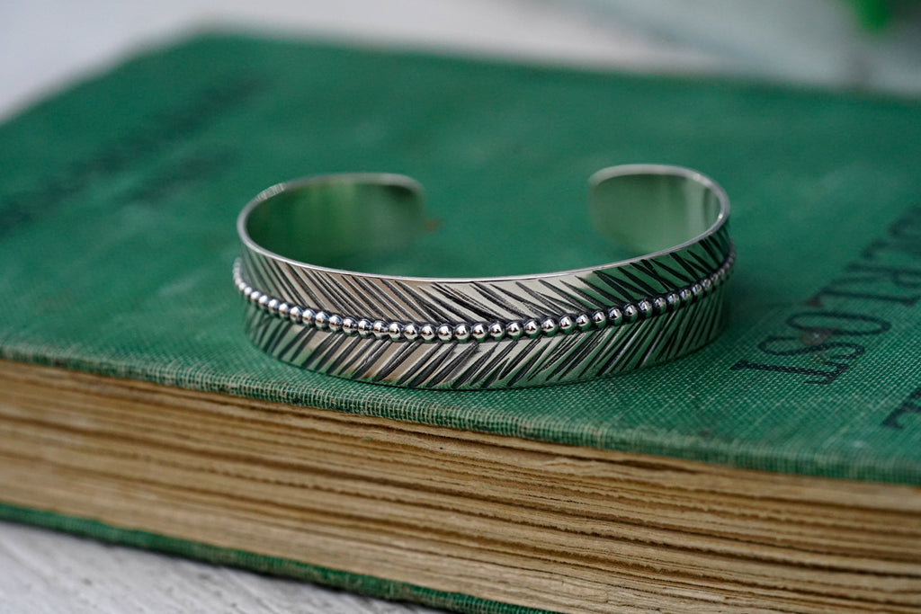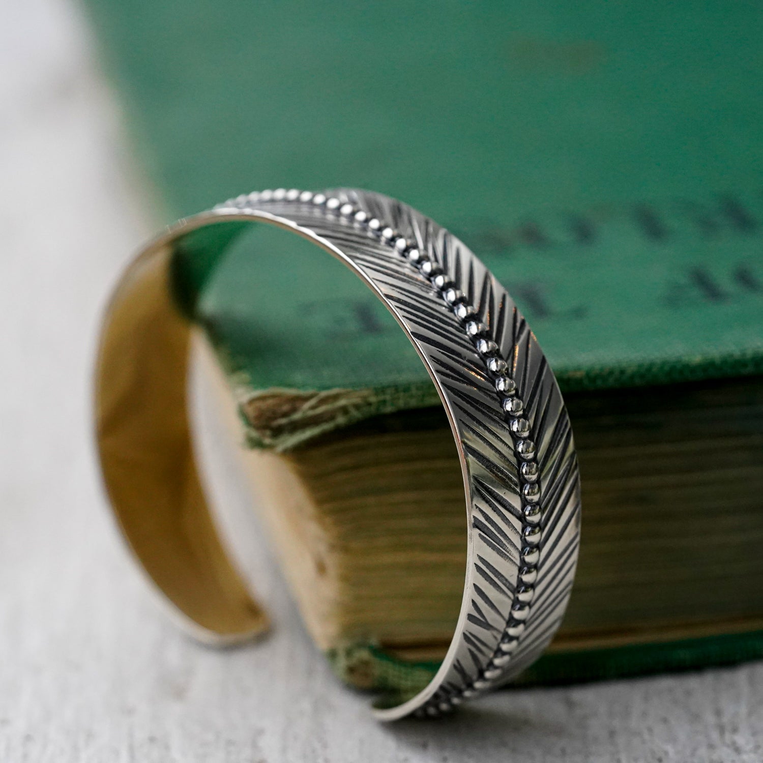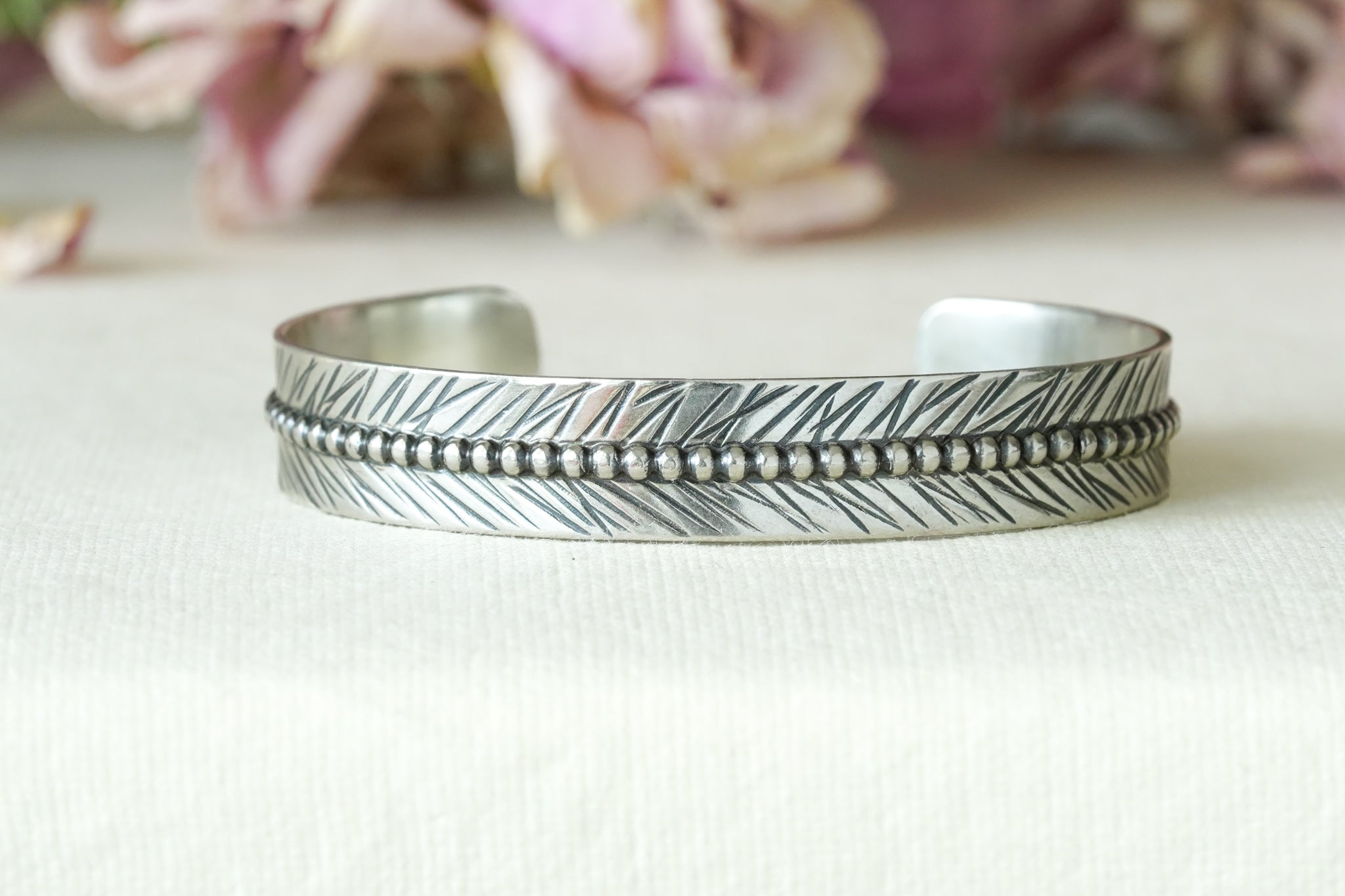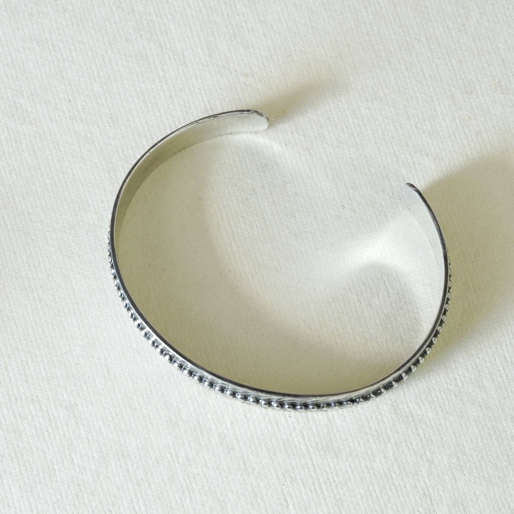 A hand-stamped, all Sterling Silver cuff with a beaded spine. Oxidized and then brushed back to reveal the metals depth. A classic addition to your wrist stack, or a perfect stand-alone bracelet.