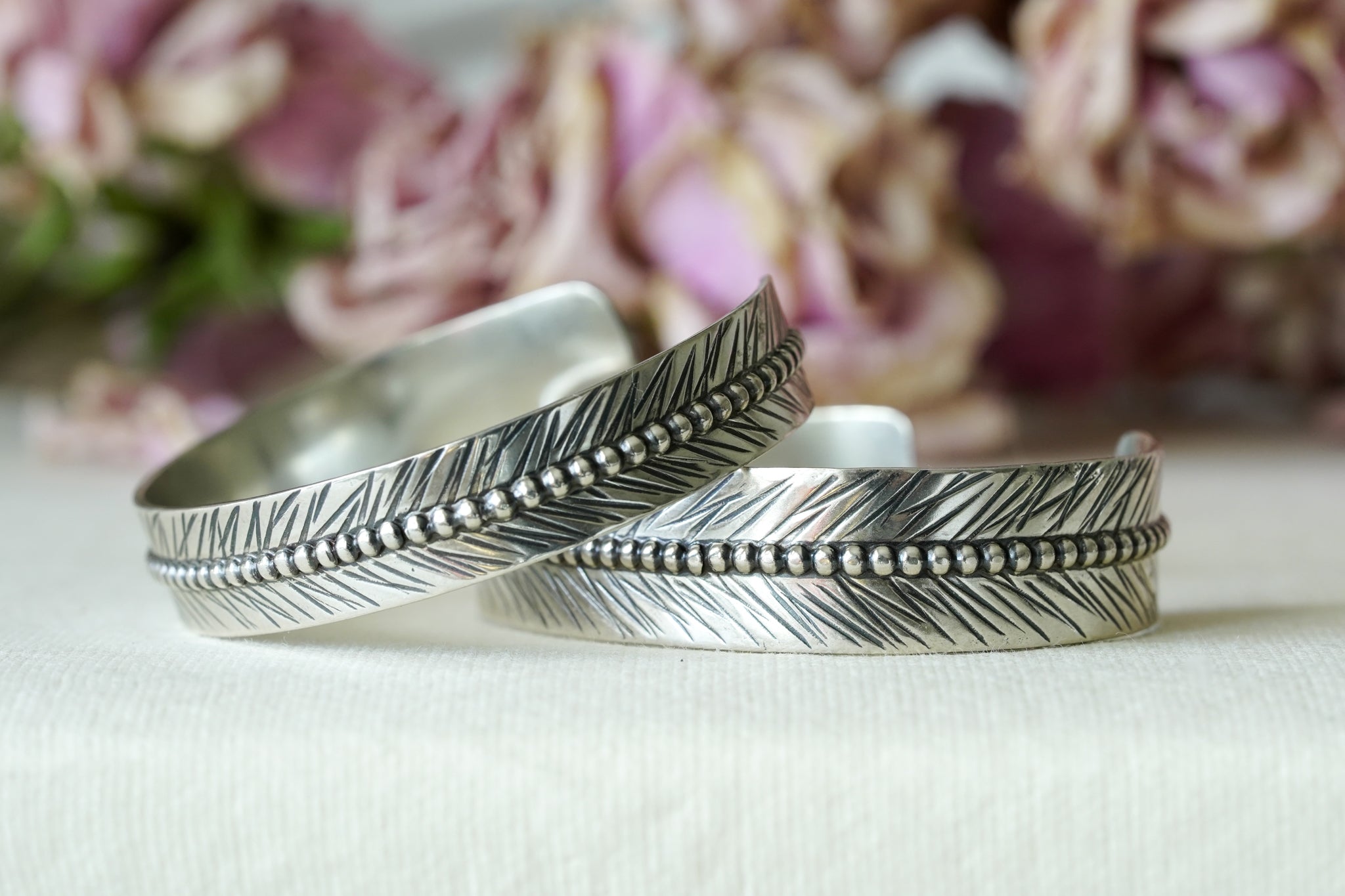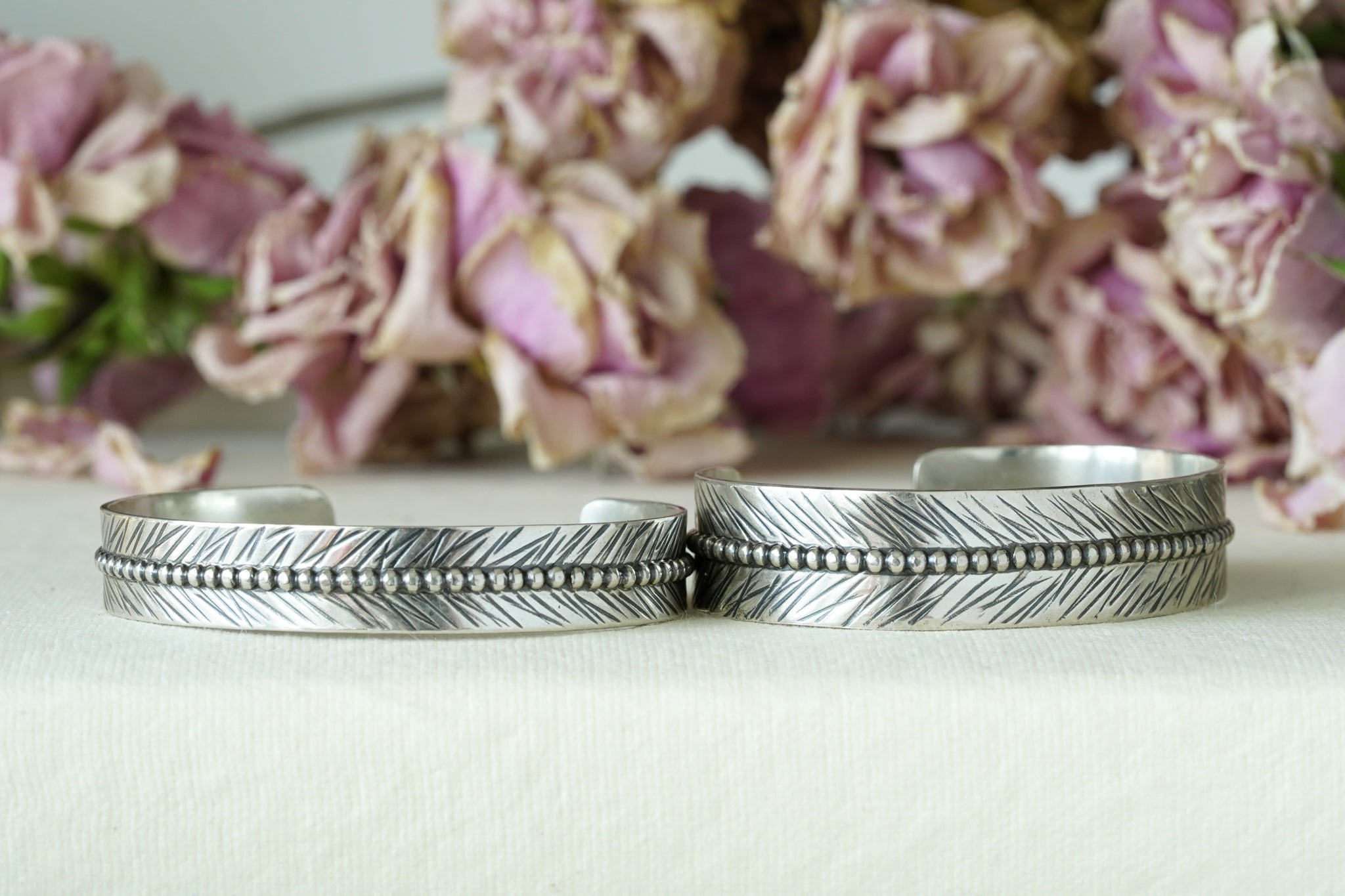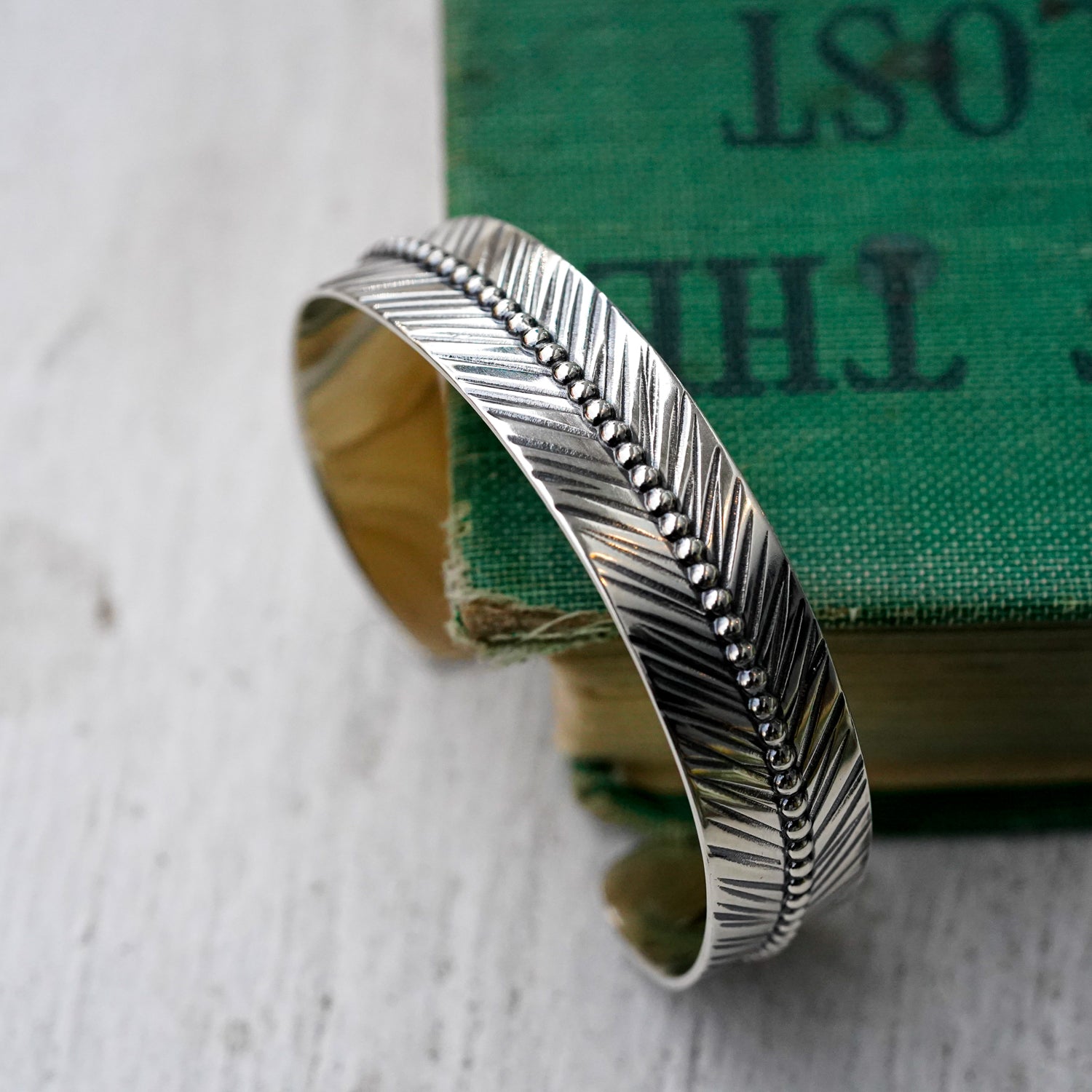 A hand-stamped, all Sterling Silver cuff with a beaded spine. Oxidized and then brushed back to reveal the metals depth. A classic addition to your wrist stack, or a perfect stand-alone bracelet.