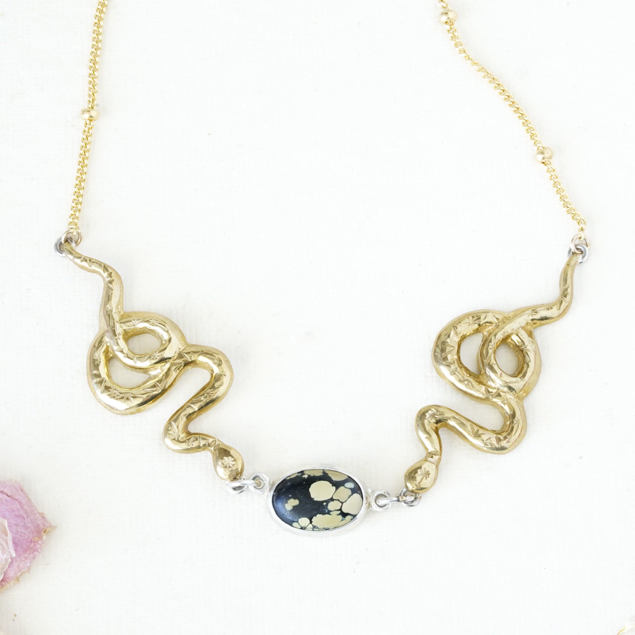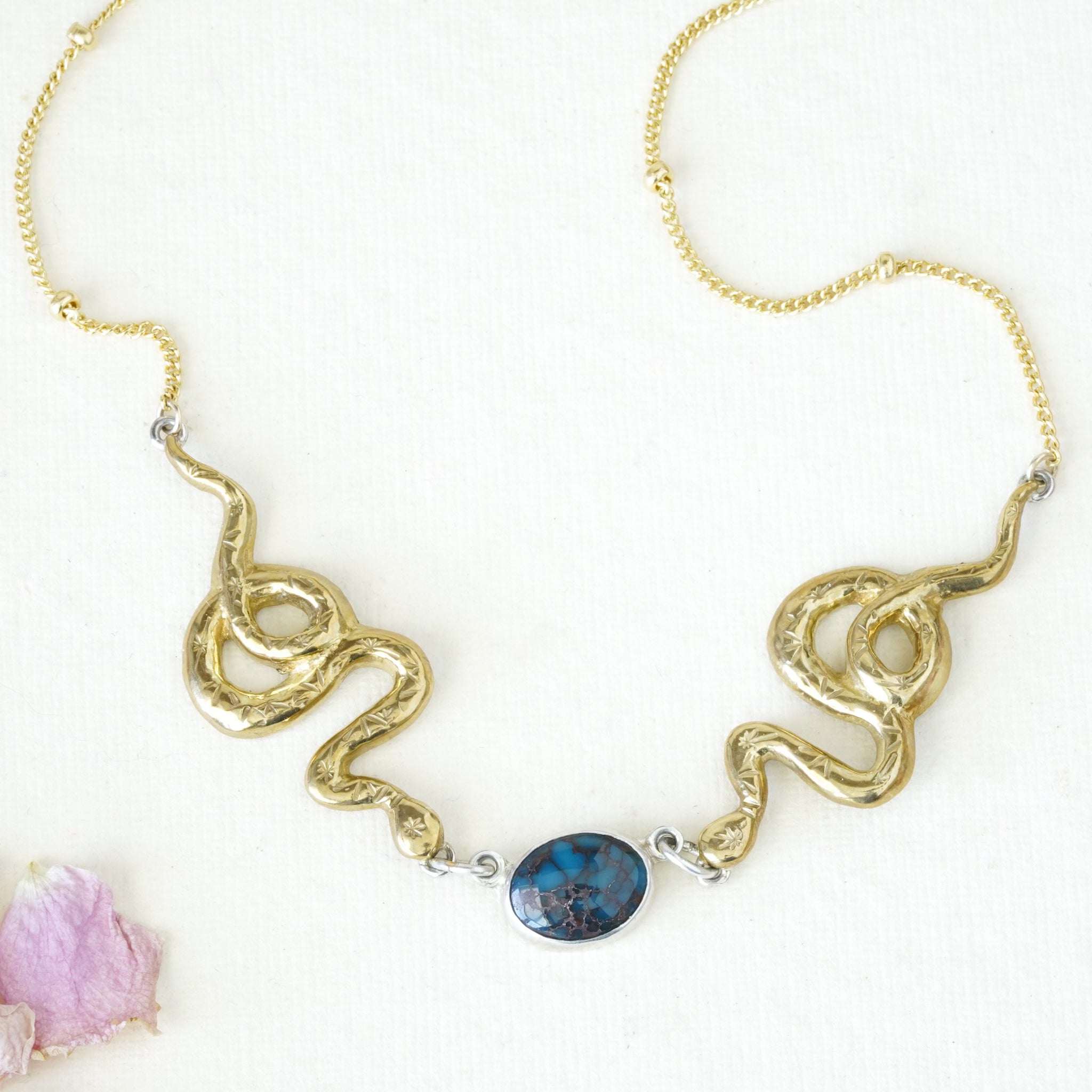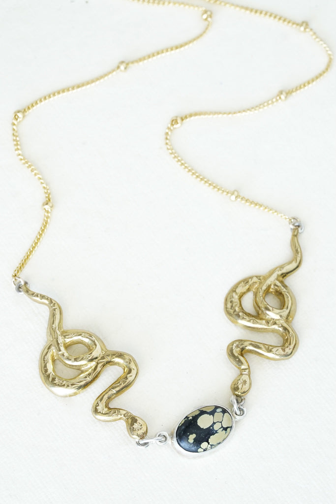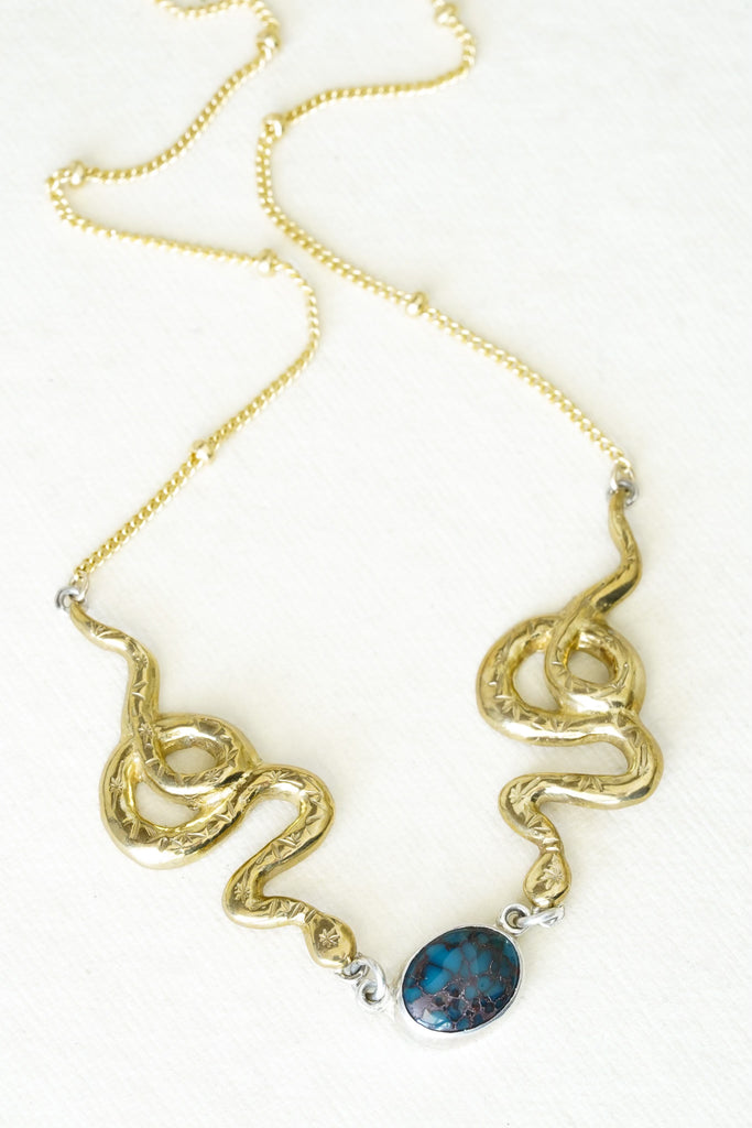 An oval turquoise is set in sterling silver between two, hand carved and stamped bronze snakes. The center piece measures about 5" across and is attached to yellow gold-fill satellite chain.