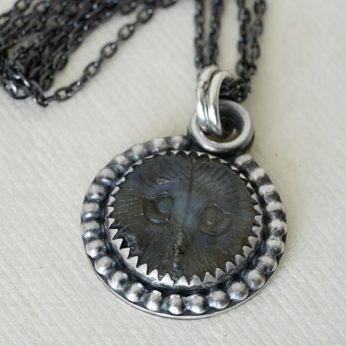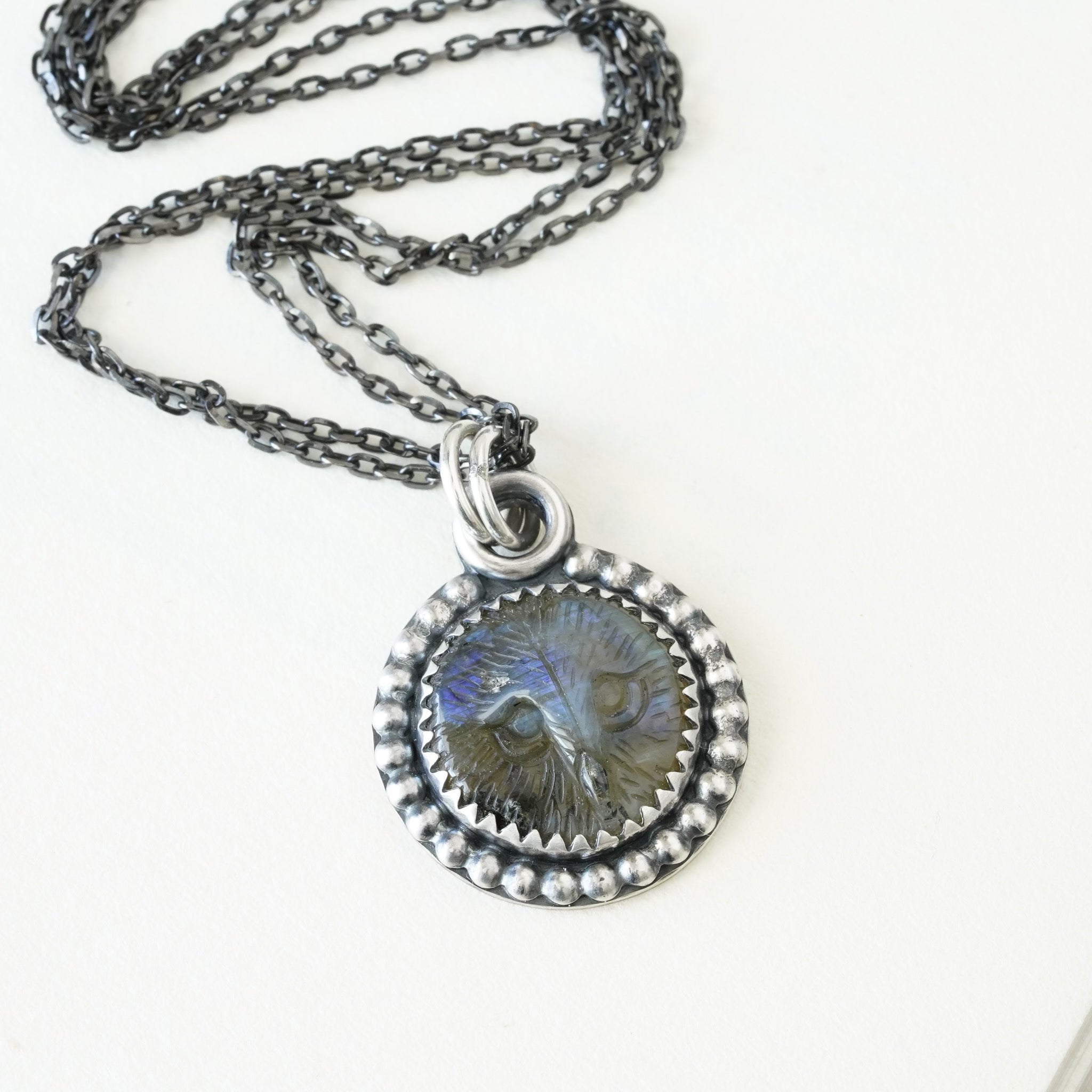 A little owl face is hand carved in a flashy piece of labradorite and set in a beaded sterling silver frame.