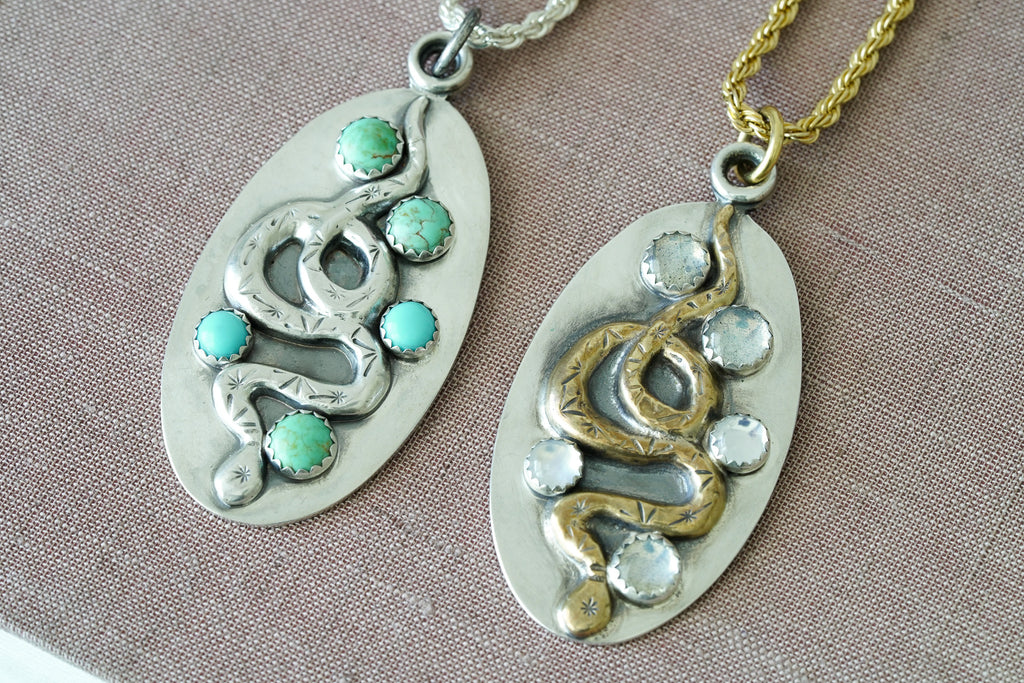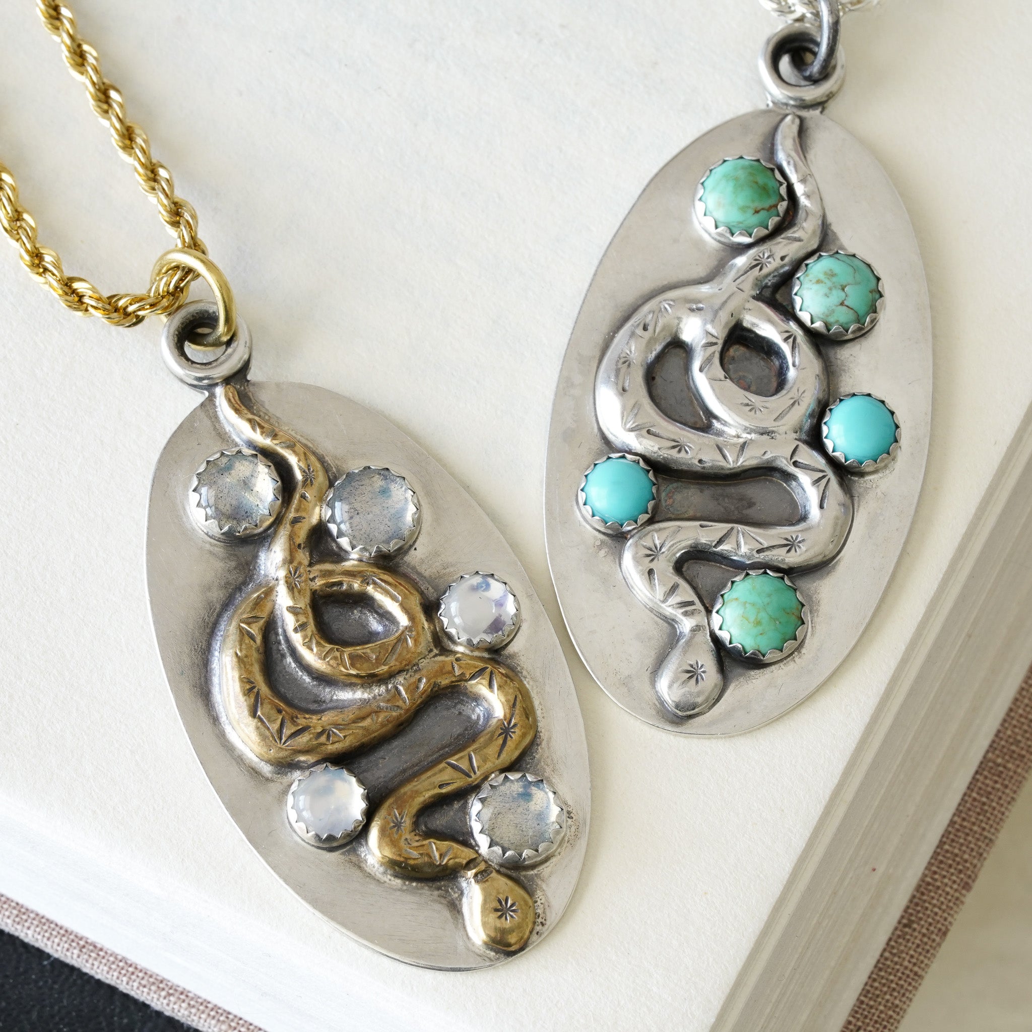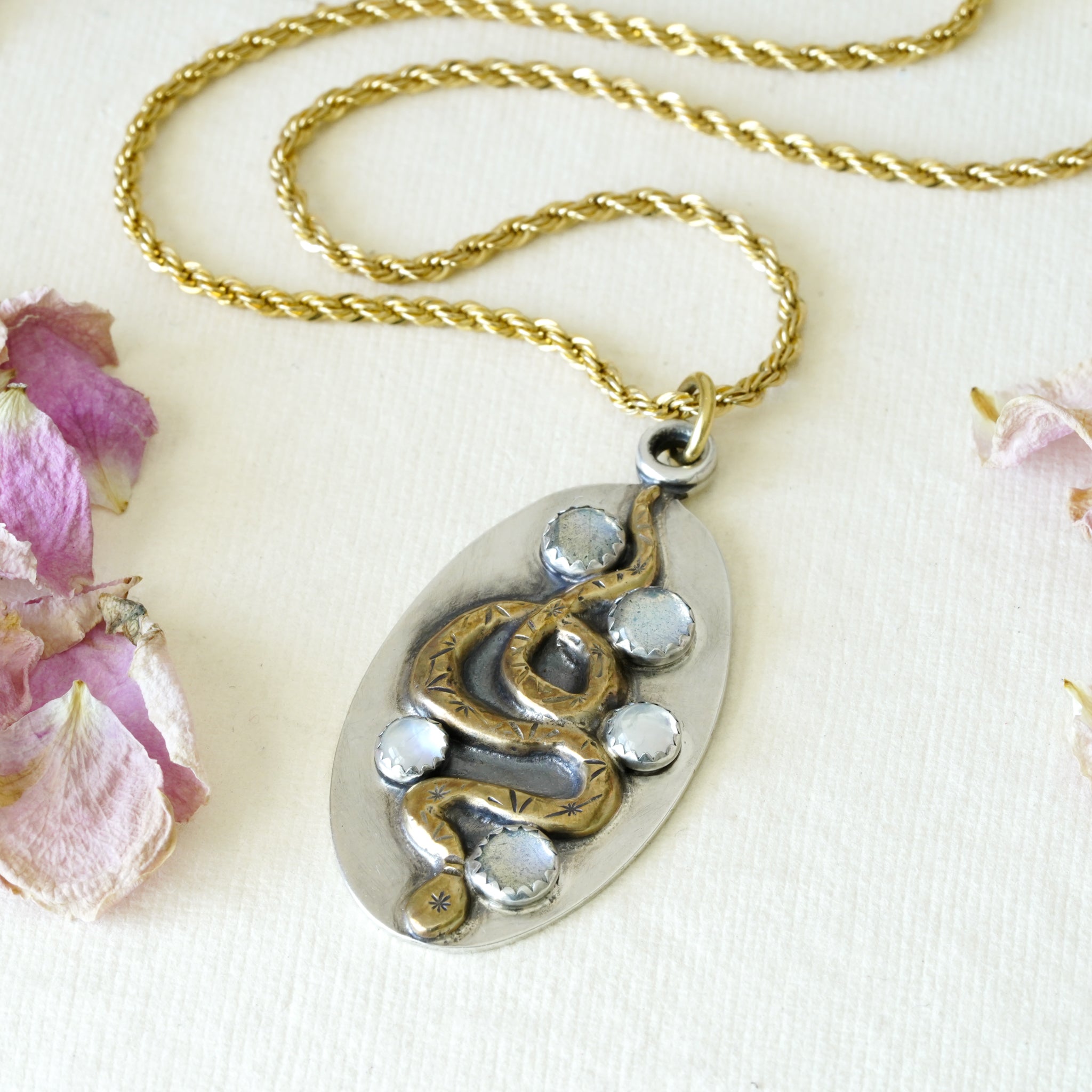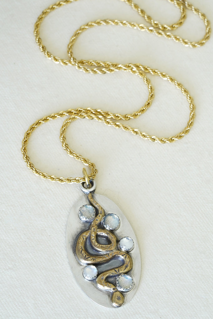 Mixed metal version is sterling silver baseplate with bronze snake and moonstone and labradorite, on a yellow gold fill rope chain.