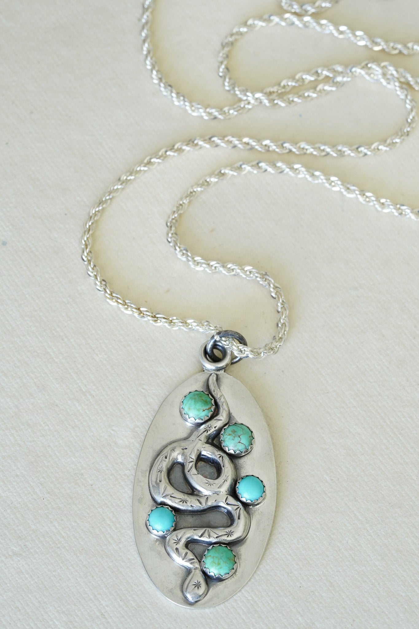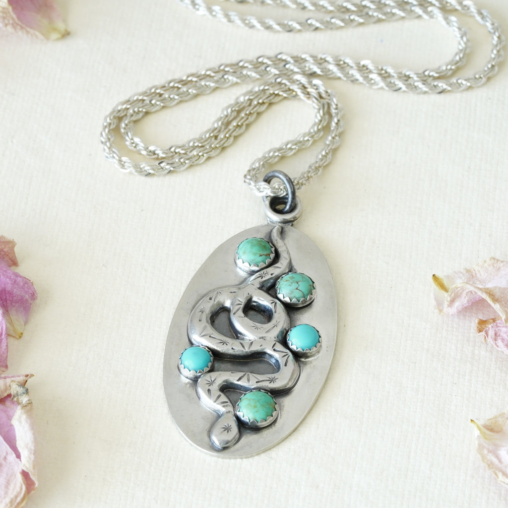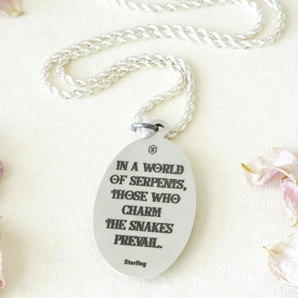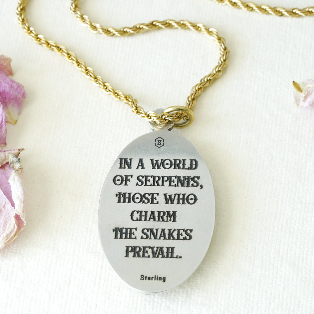 A hand-stamped snake is mounted on a sterling silver plate, with stones set all around it. Engraved on the back are the words "In a world of serpents, those who charm the snakes prevail."
