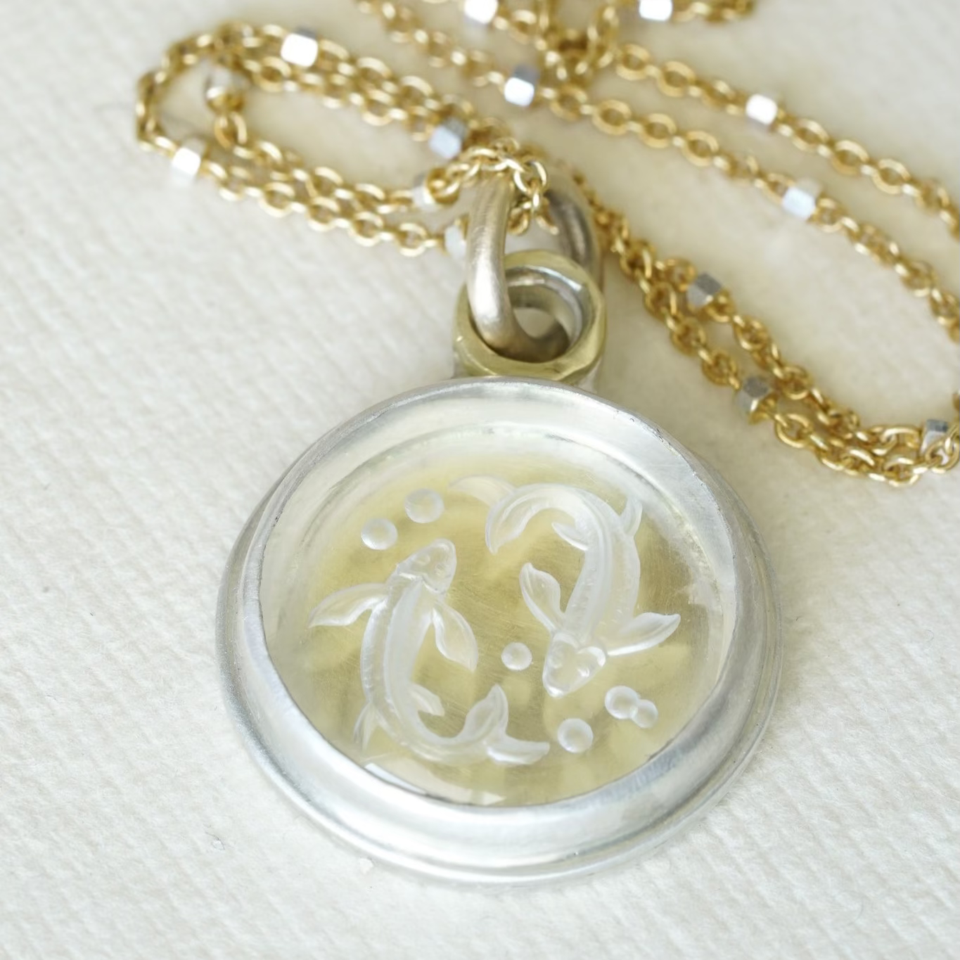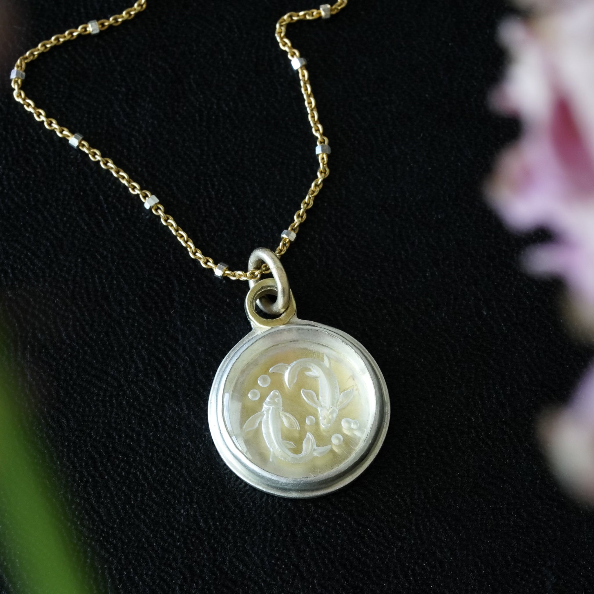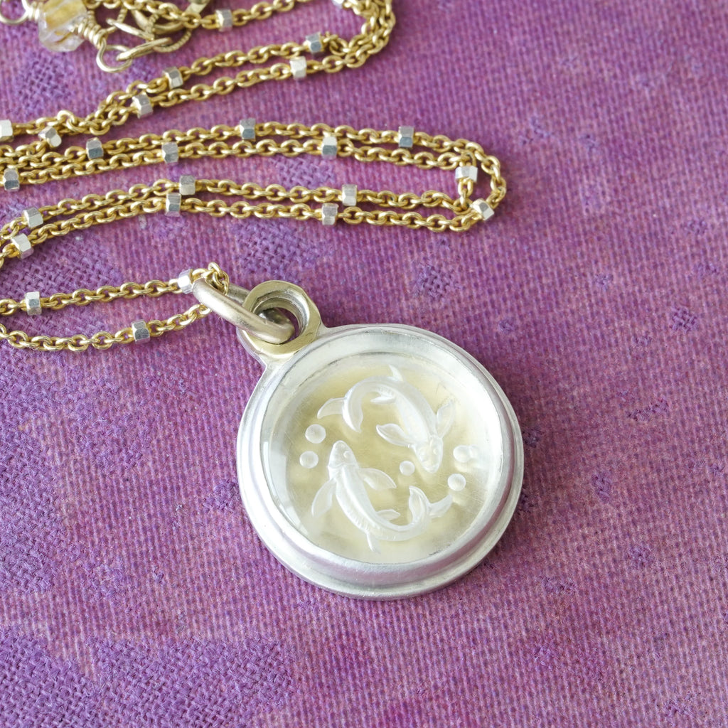 Two fish are hand carved in a round piece of quartz and set on sterling silver with a 14k yellow gold jump ring.