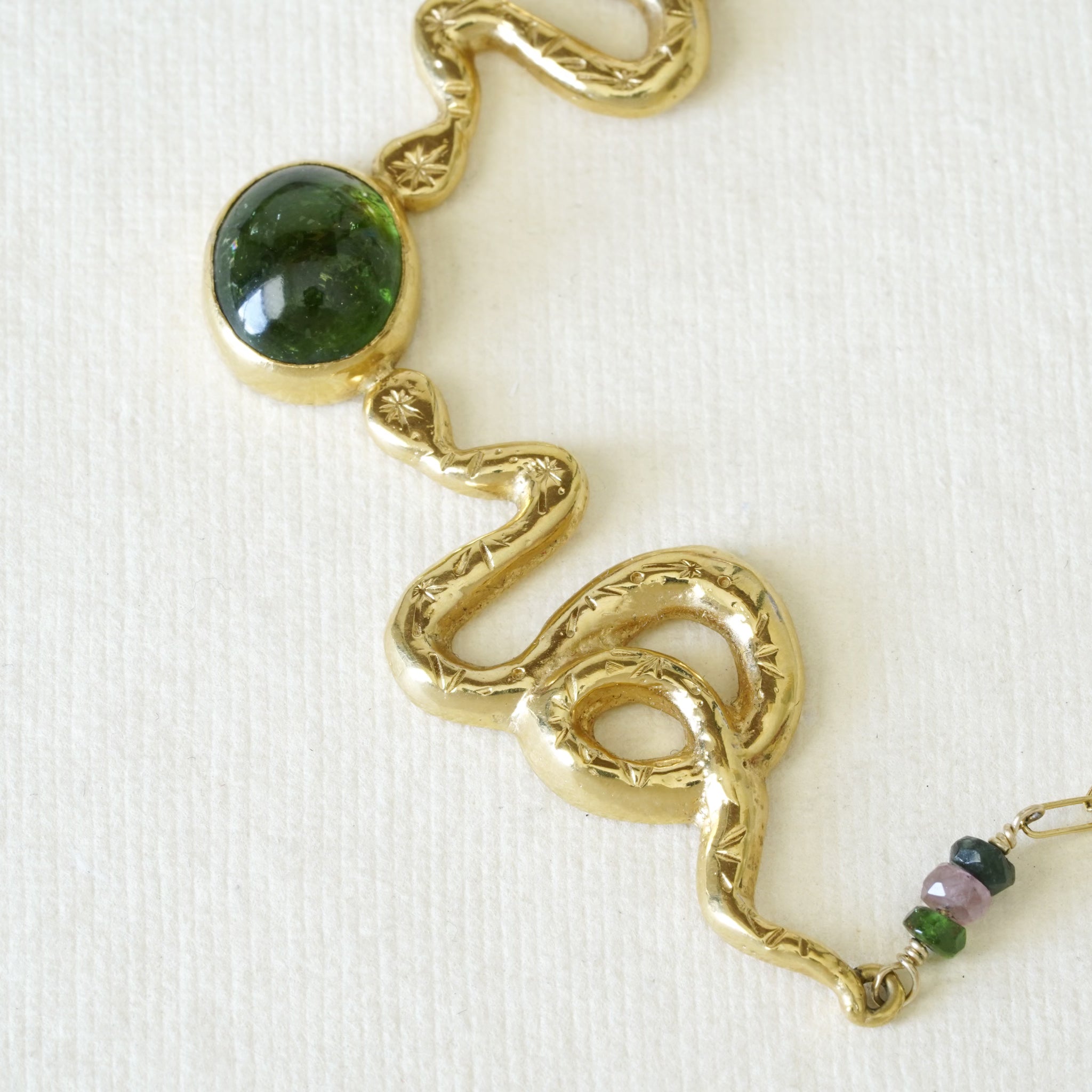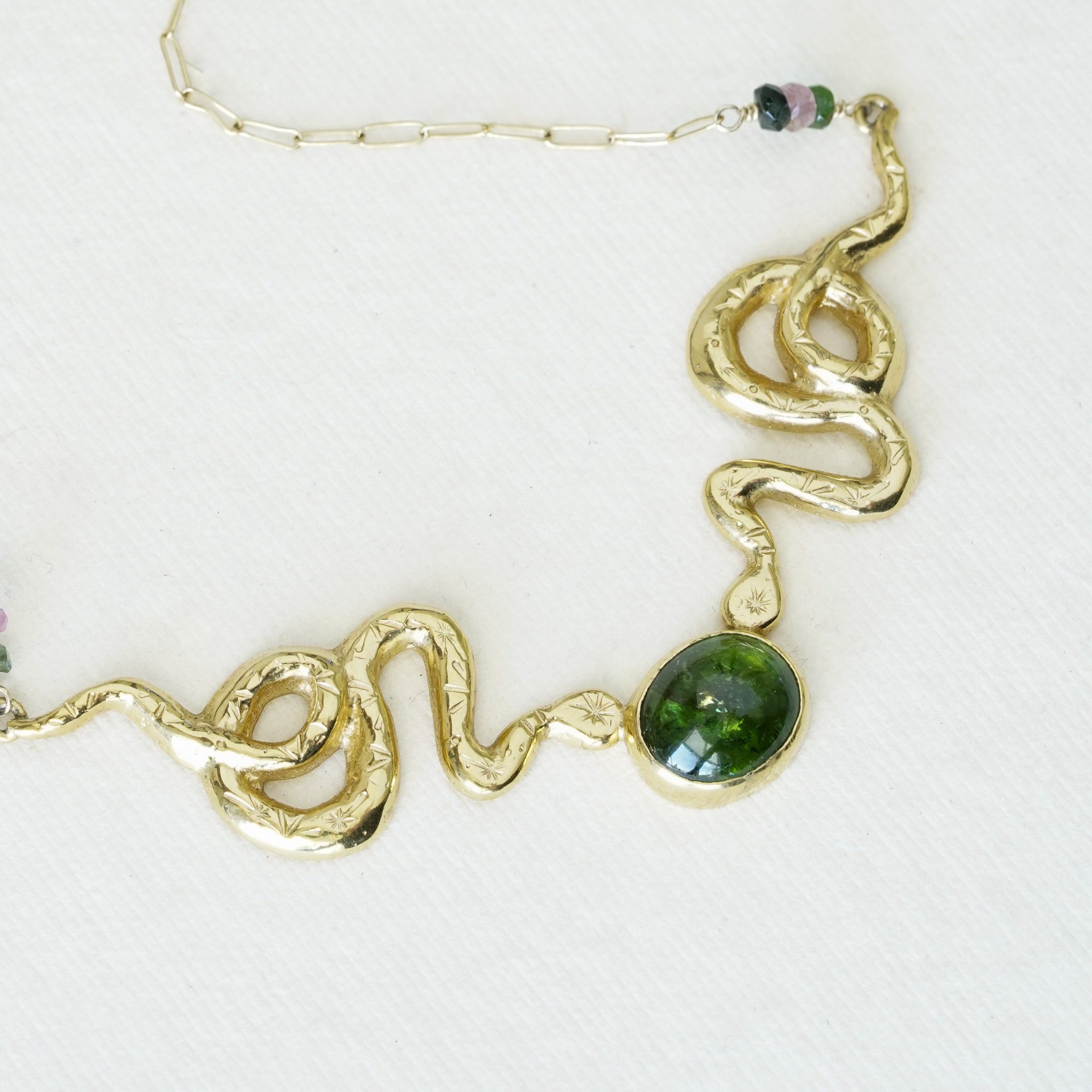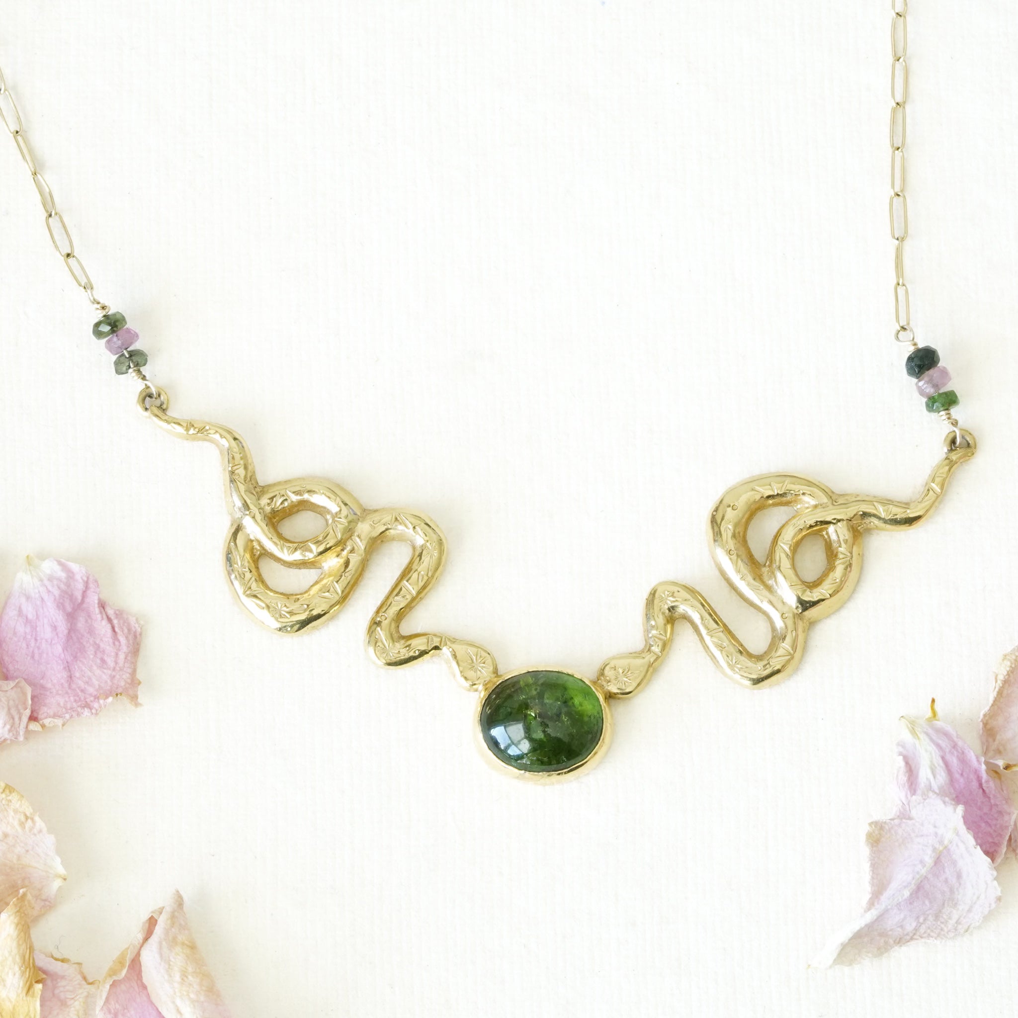 A rich green tourmaline is set between two, hand carved and stamped bronze snakes and then plated in 14k yellow gold. The pendant measures 3" tail to tail and is tied to yellow gold-fill chain with watermelon tourmaline beads.