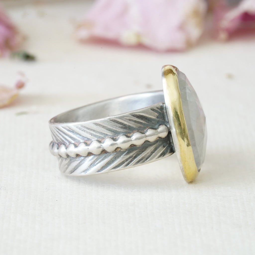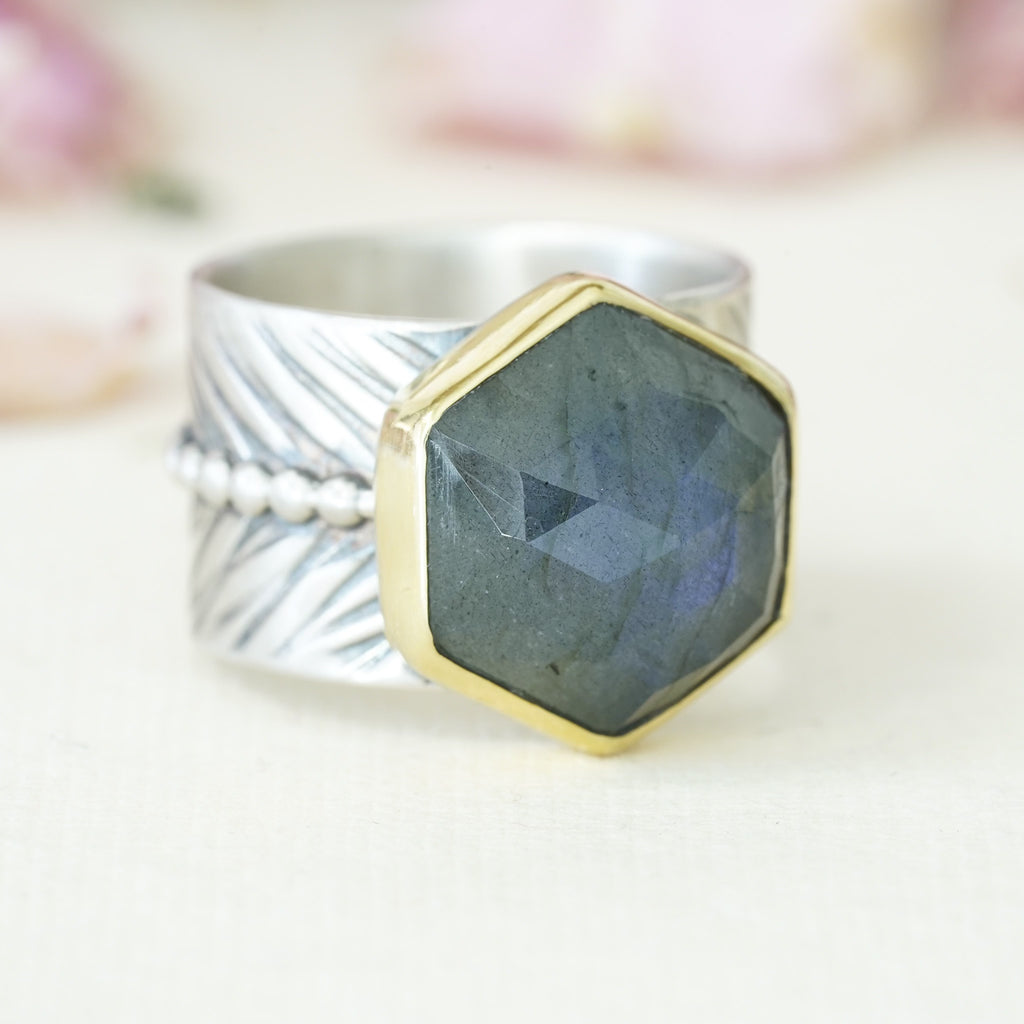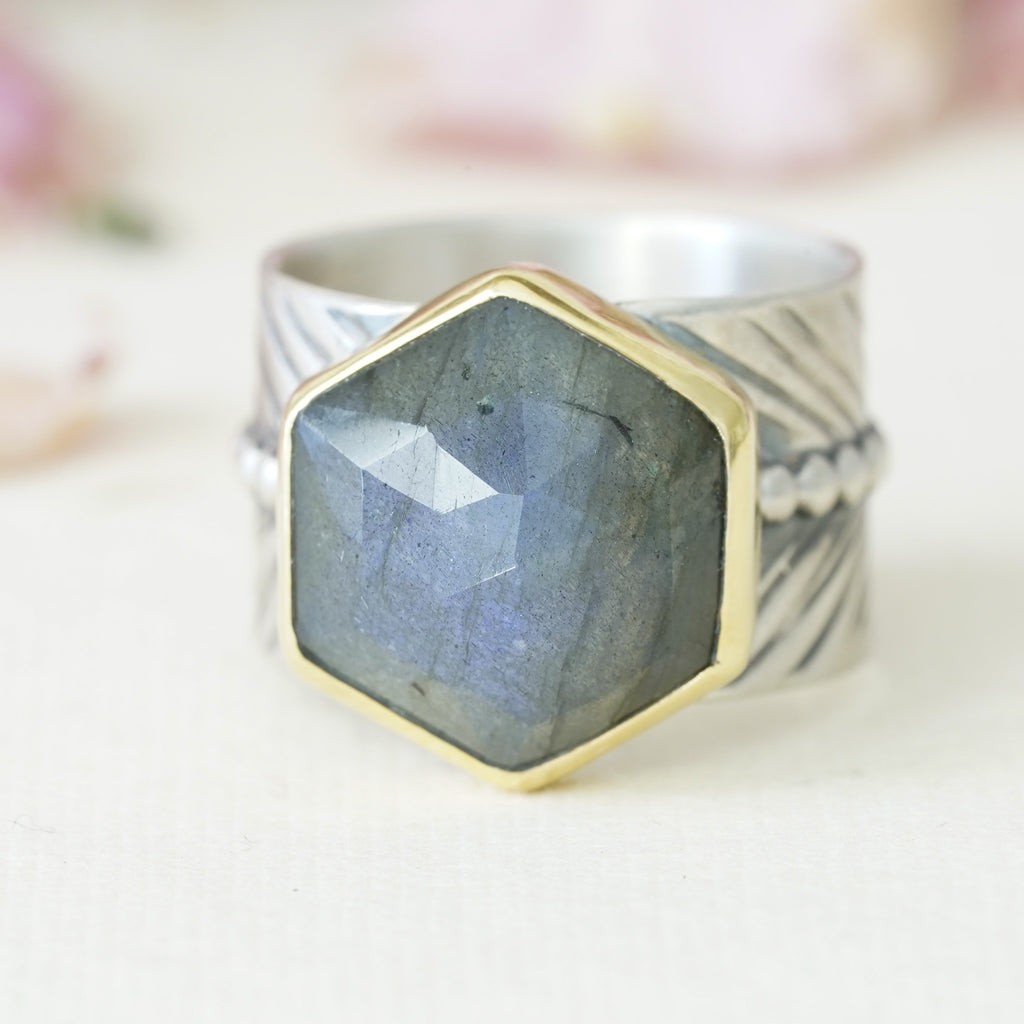 22k Gold & Silver Hexagon Labradorite Ring - Size 7.75