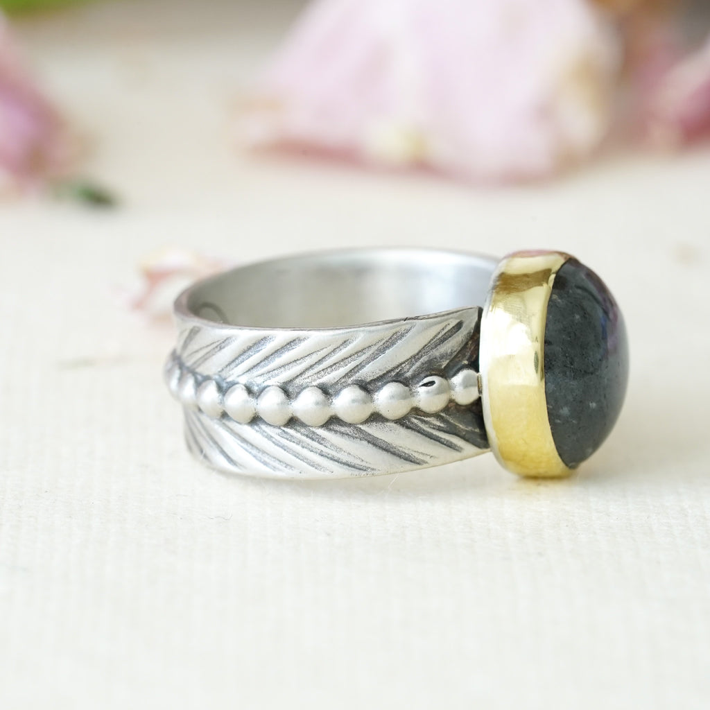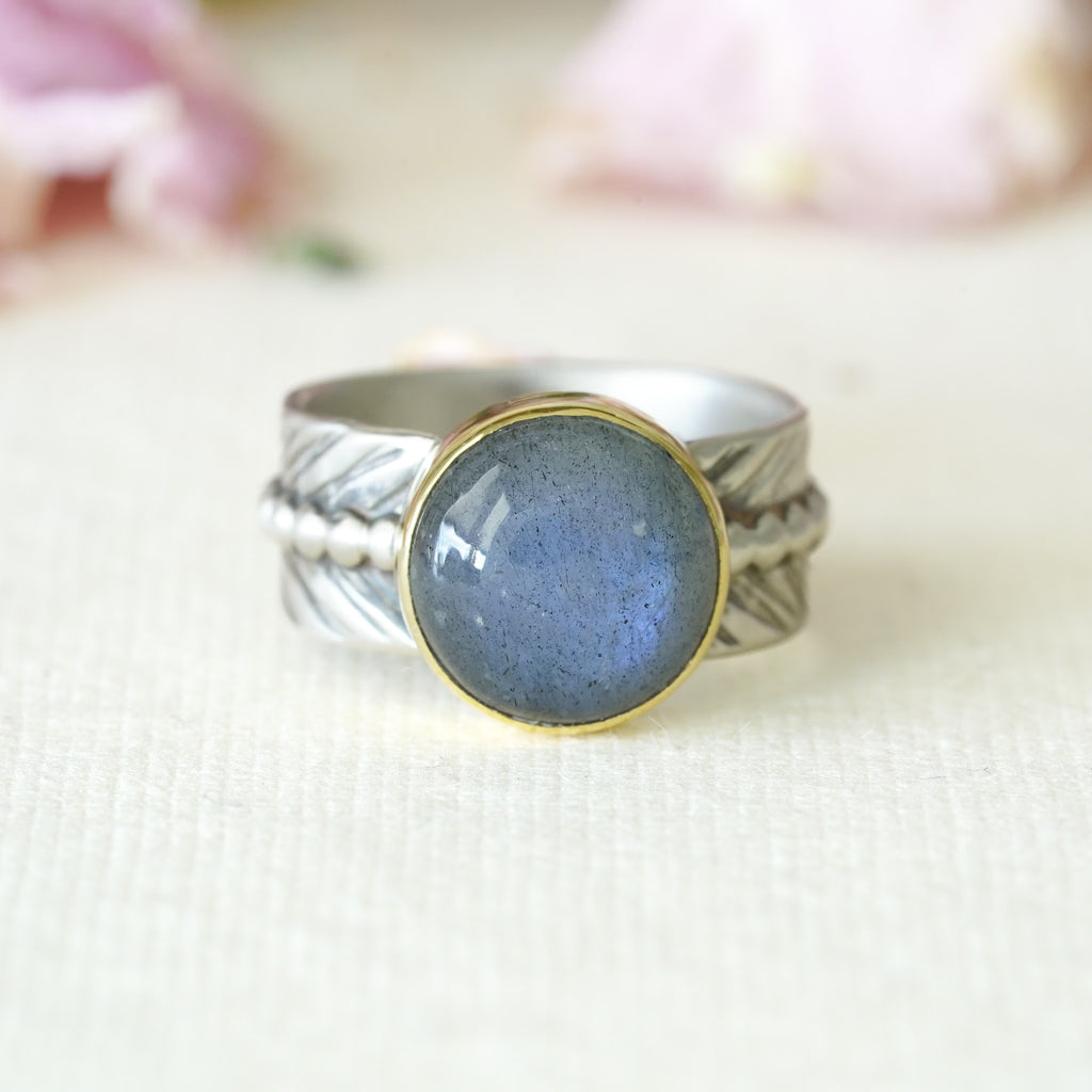 22k Gold & Silver Round Labradorite Ring - Size 6