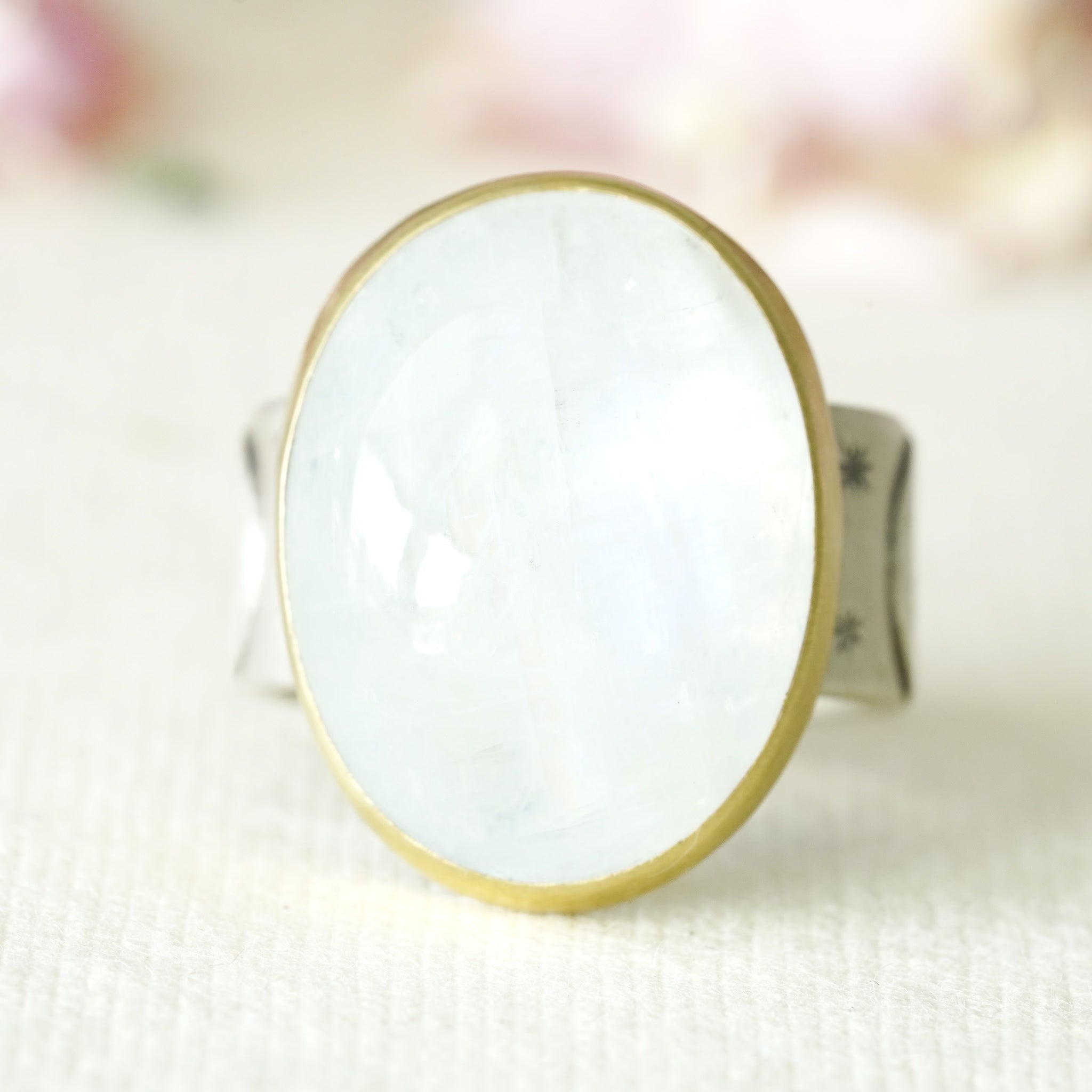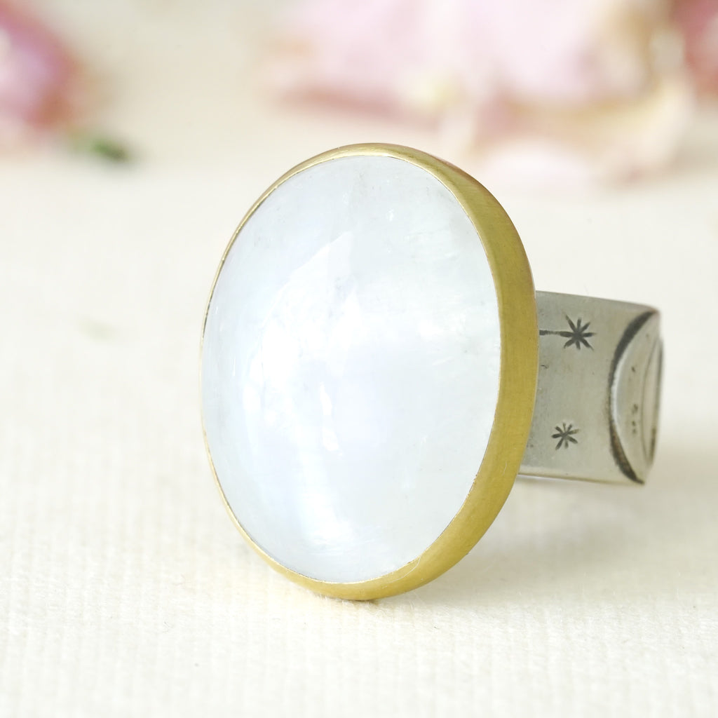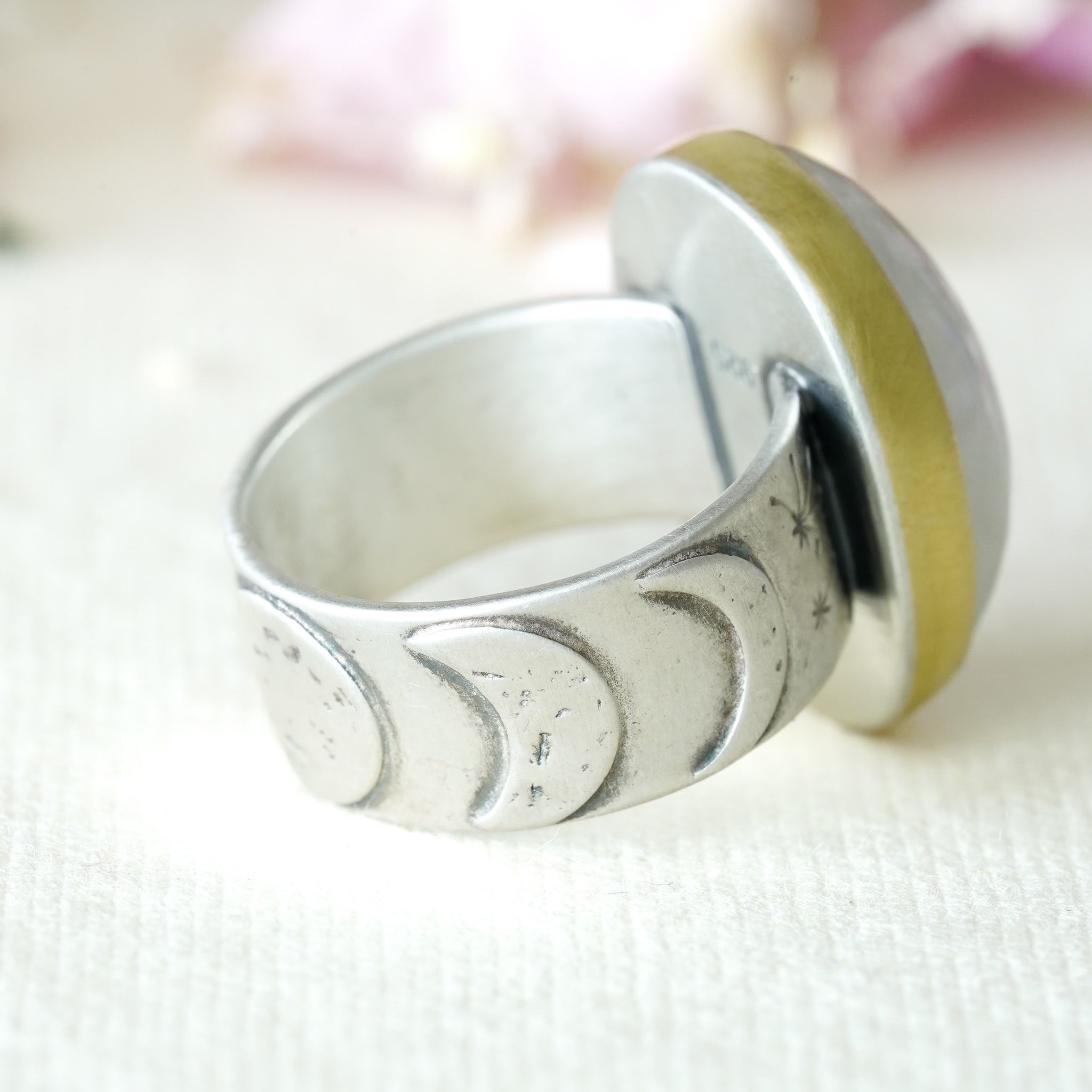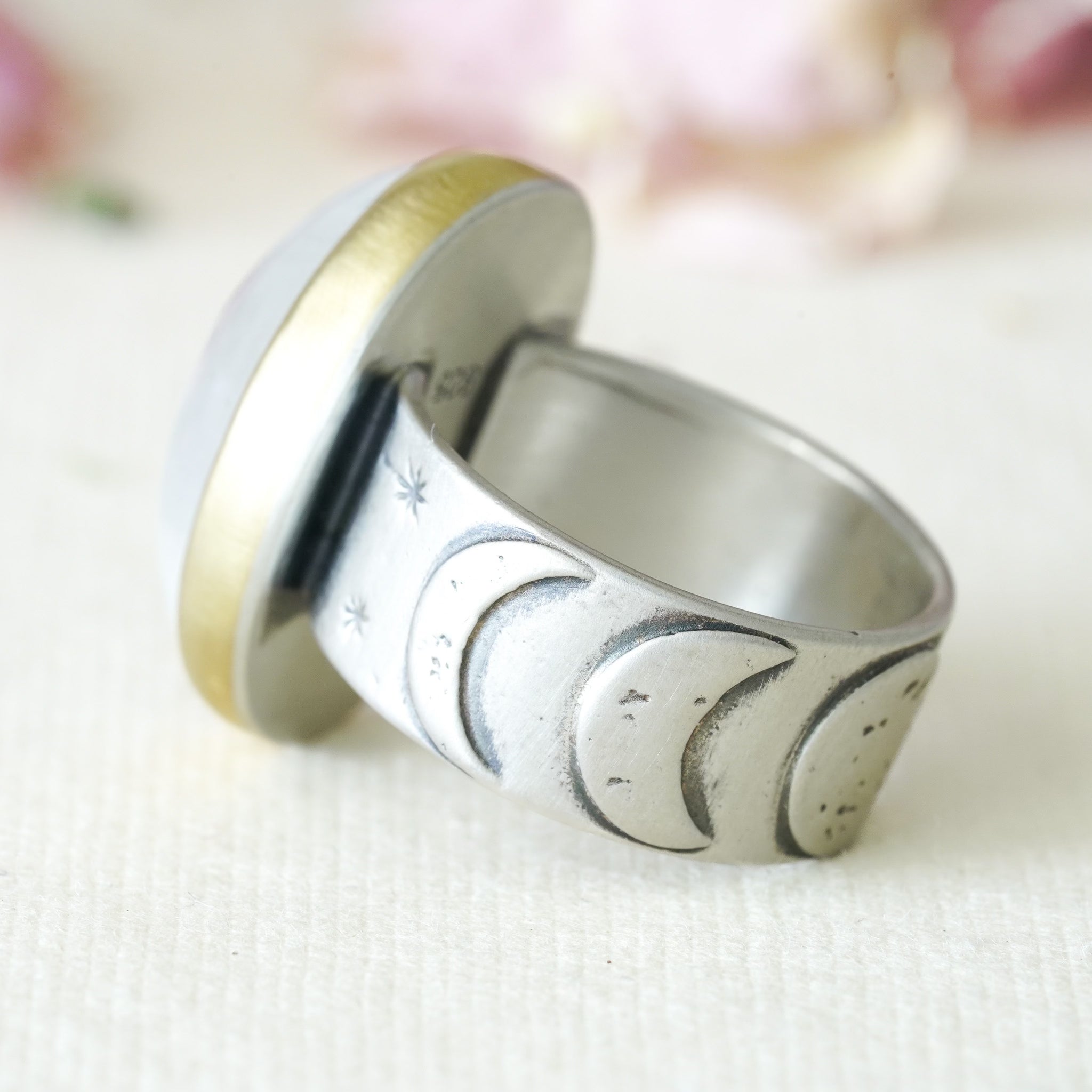 22k yellow gold hugs a flashy, rainbow moonstone on a sterling silver baseplate with our signature moon phase sterling silver band.