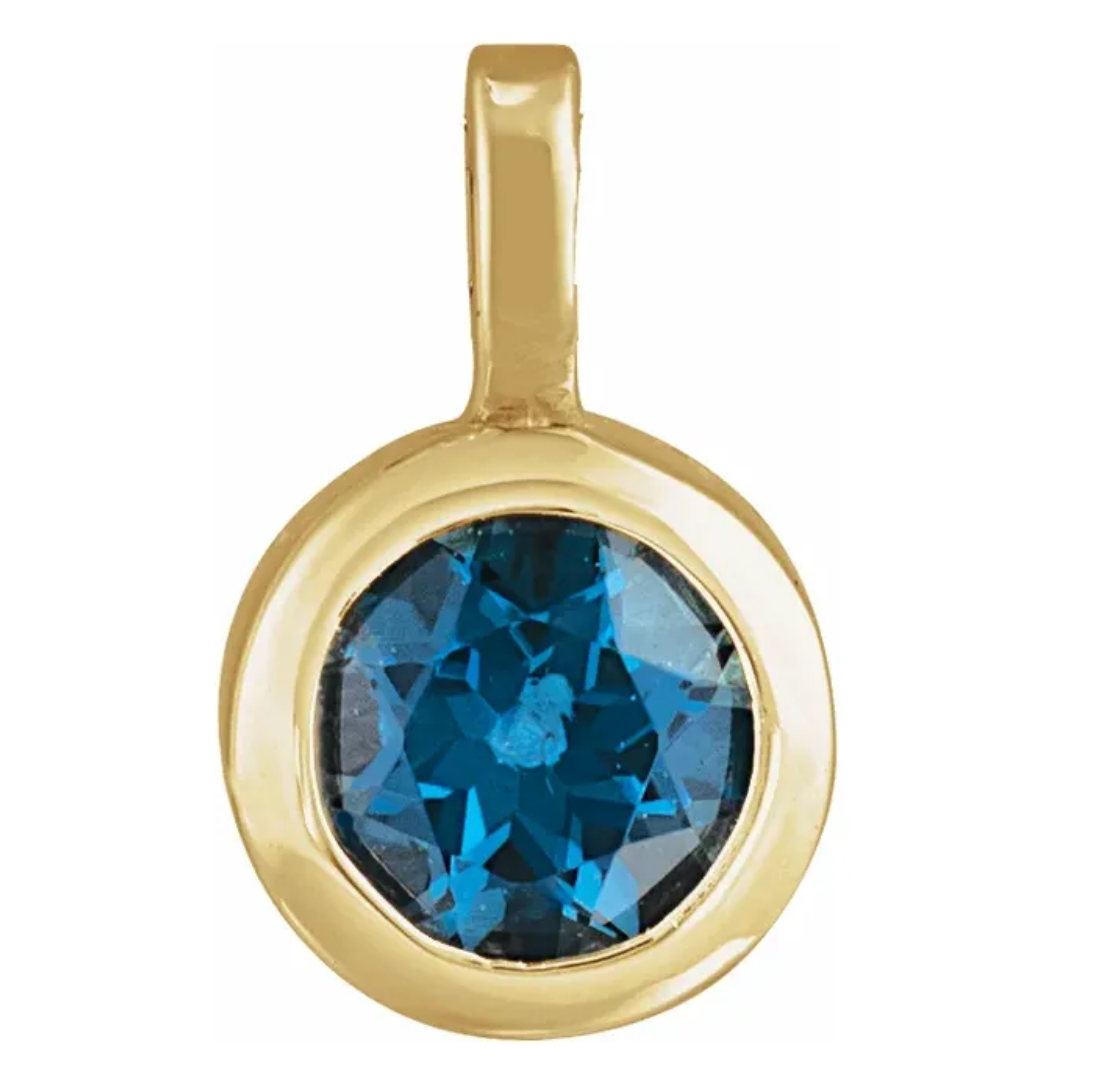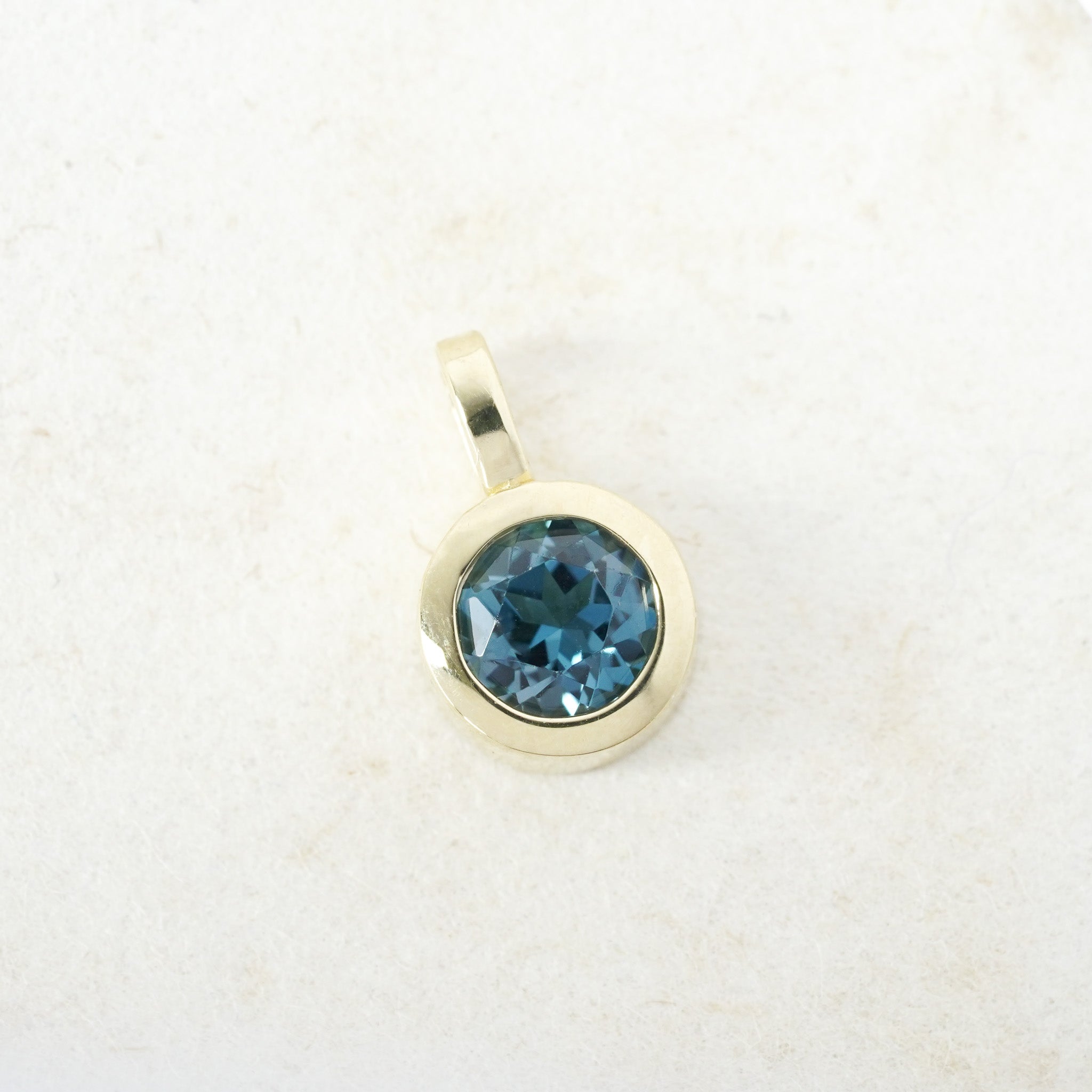 This pendant features a richly colored London blue topaz, wrapped in 14k yellow gold.
