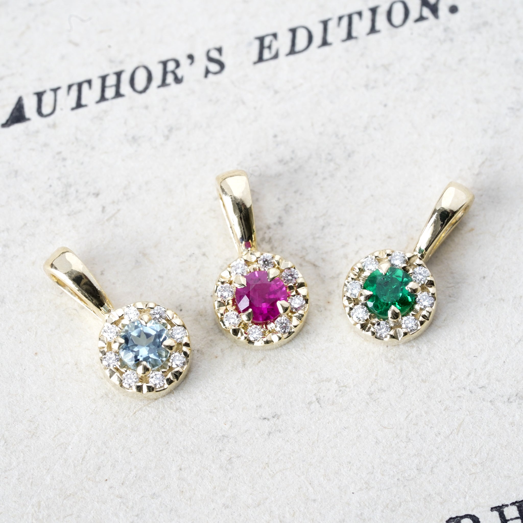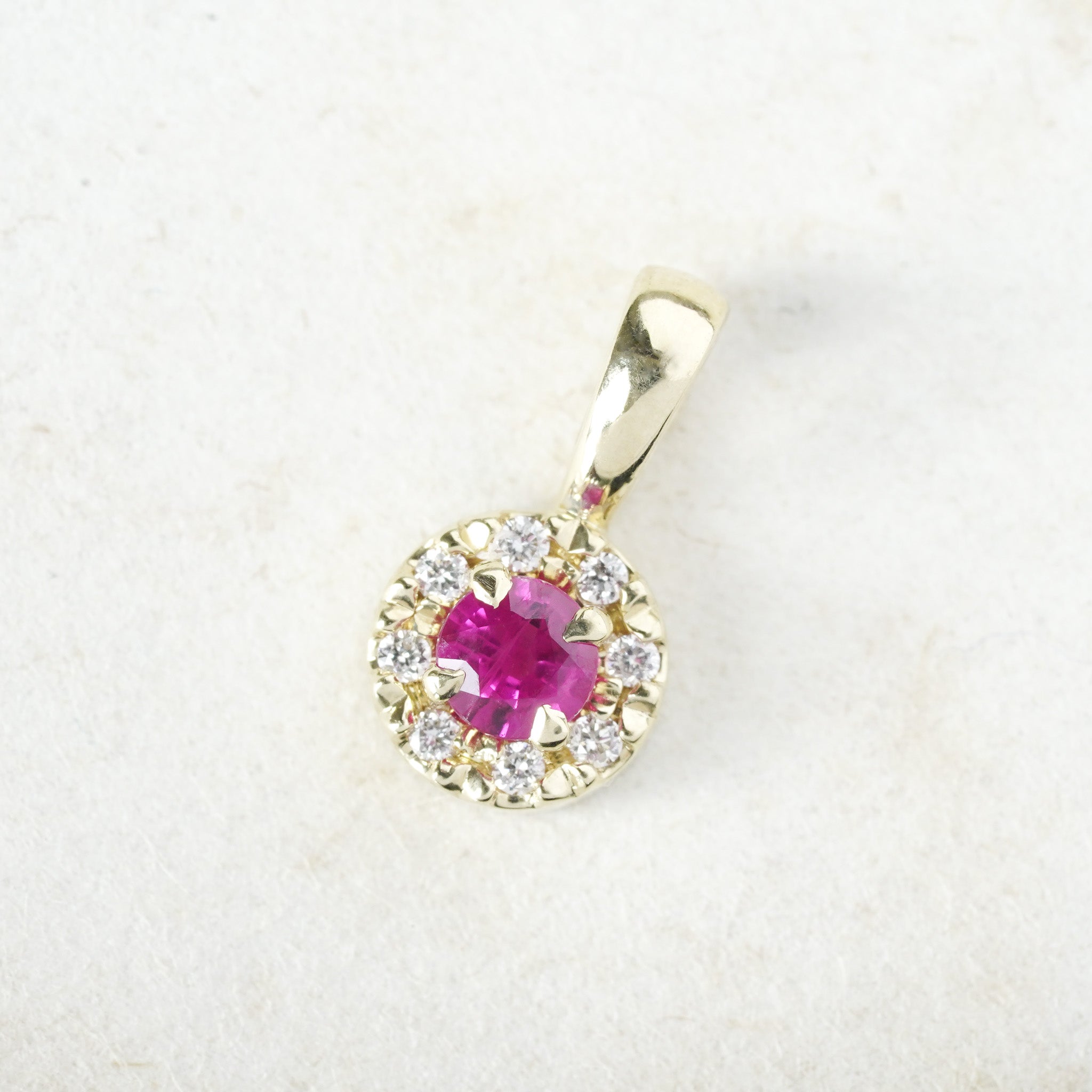 This pendant features a halo of natural diamonds encircling a sparkling ruby all set in 14k yellow gold.