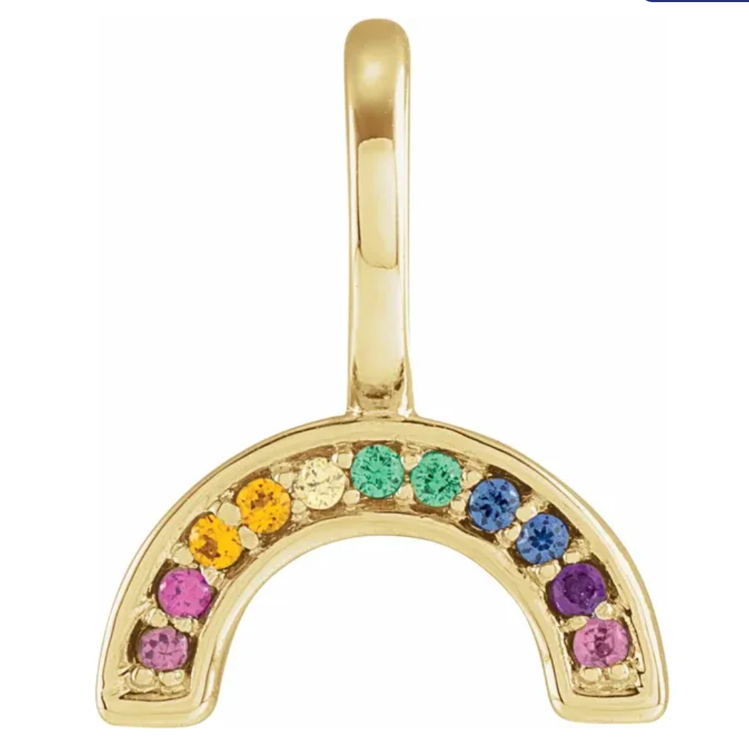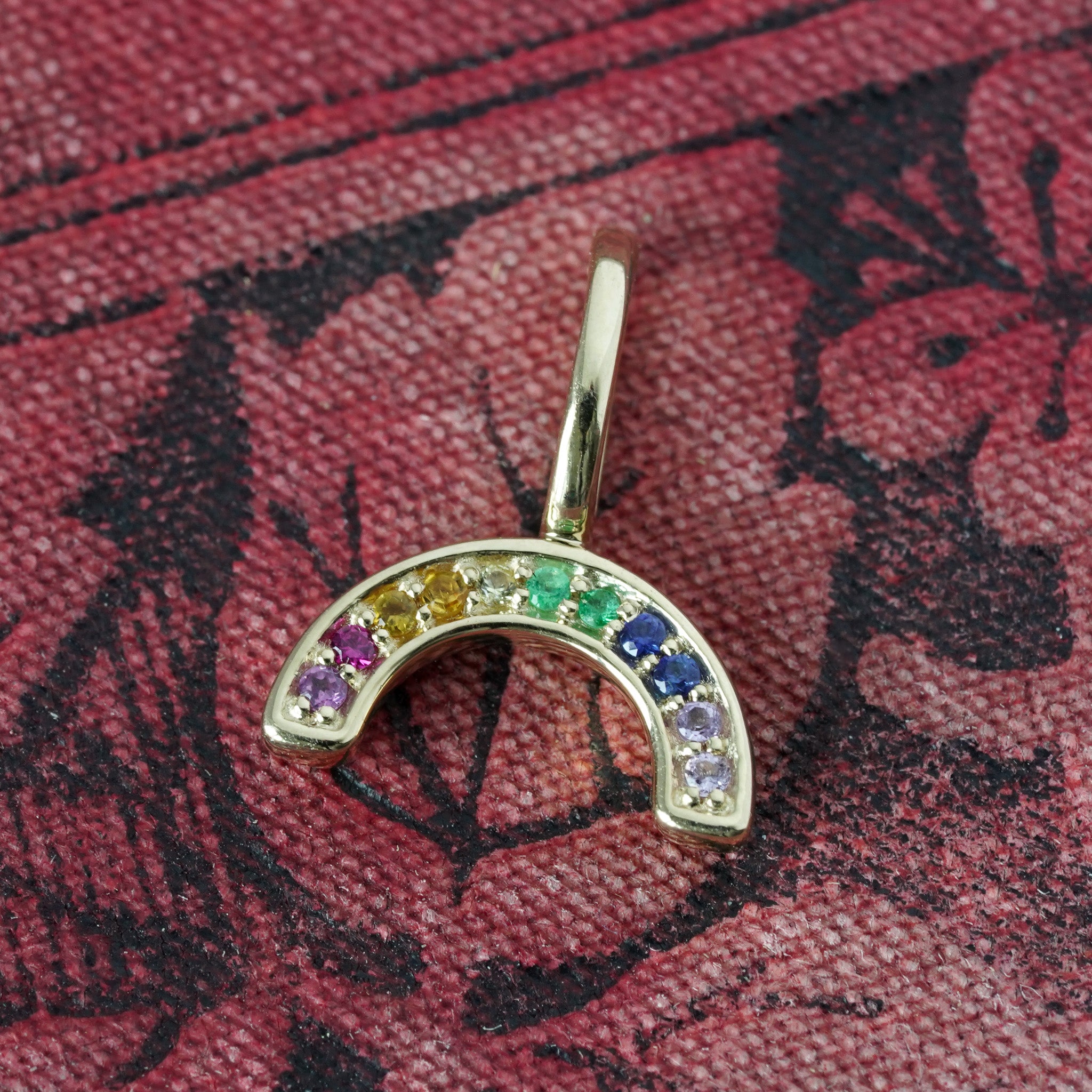 Rainbows have a variety of symbolic meanings across many cultures. For some, it is a symbol of hope or good fortune to come. For others, it is a sign of inclusivity or all-embracing love. This sweet little rainbow features an arch of natural citrine, emerald, amethyst, blue sapphire, rhodolite, ruby and yellow sapphire, all set in 14k yellow gold.