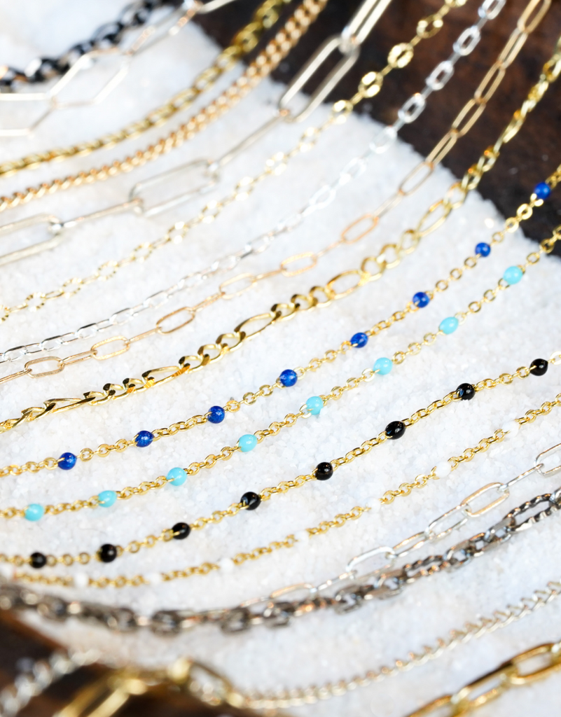 Chain color depends on your lifestyle as well as the metal. Hot springs, salt and highly chlorinated water can tarnish silver. You can always do your best with a polishing cloth, but sometimes the patina is part of the beauty - the way the chain changes over time gives it character! Solid 14k gold chains are more expensive because gold is the most durable and likely to hold its color for a lifetime, which makes it ideal for permanent jewelry. 14k gold fill is 14k that is pressure bonded over brass, eventually the 14k gold will start to wear, we can't say how long it will last as it depends entirely on the chain and how much wear it receives but we estimate anywhere from 1-3 years before the chain loses it's luster.