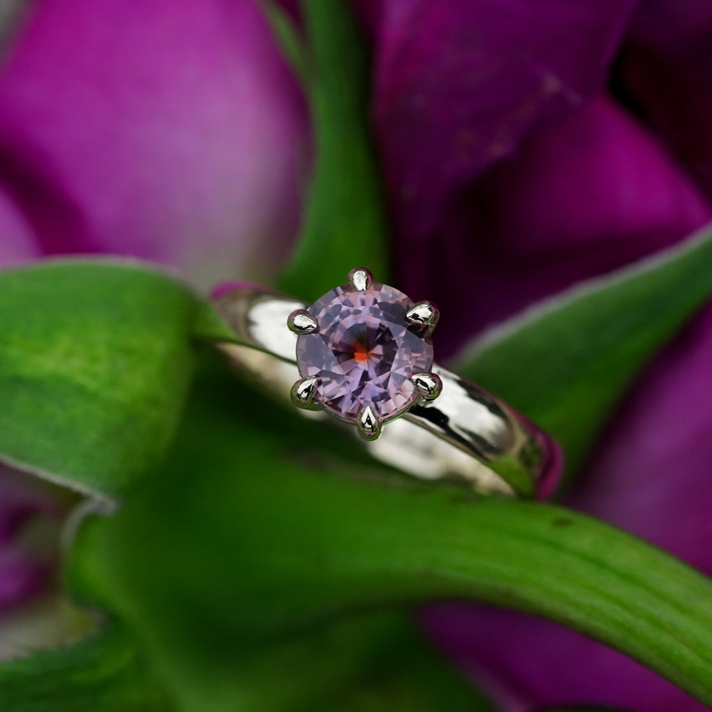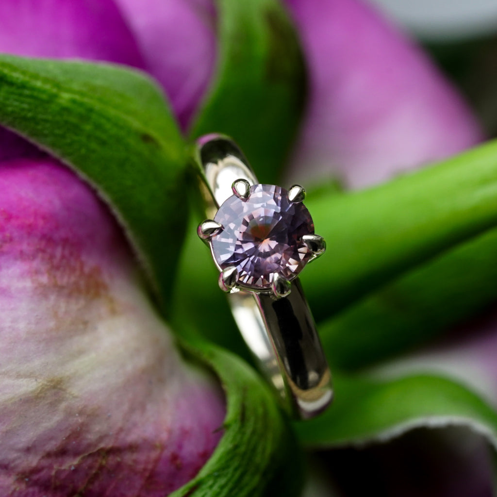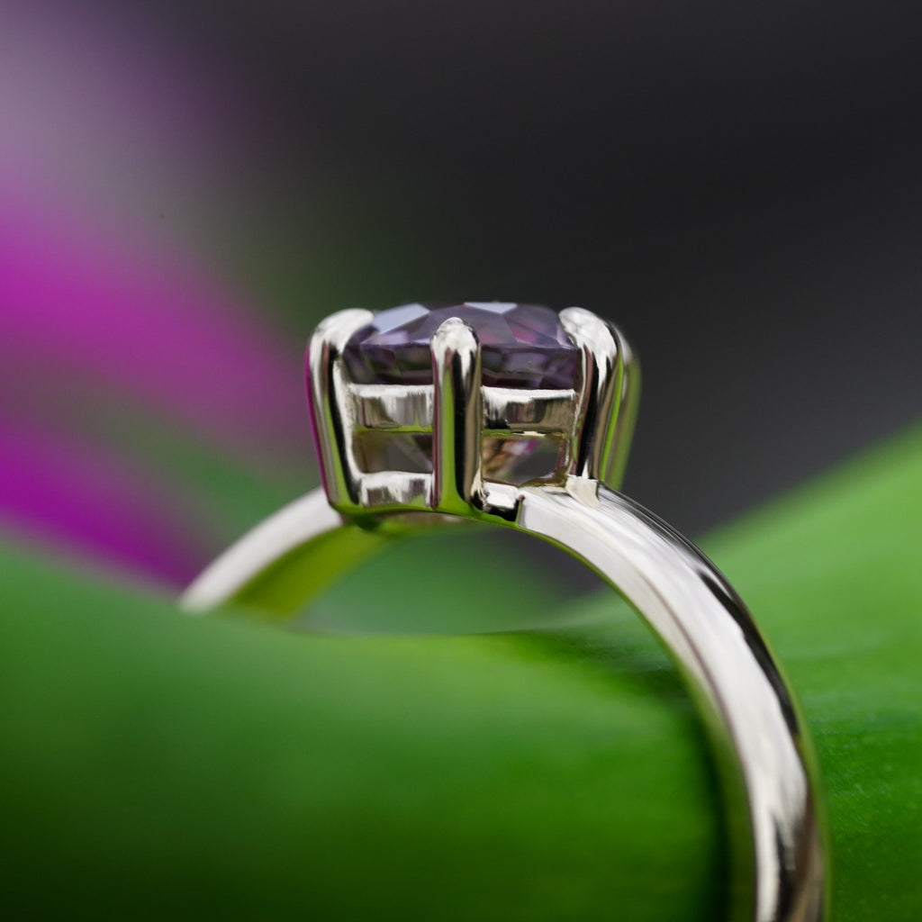 To help you estimate more confidently, here’s a visual example of a classic engagement ring baseline, featuring a round Montana purple sapphire in a six-prong solitaire setting with a substantial 3mm band.