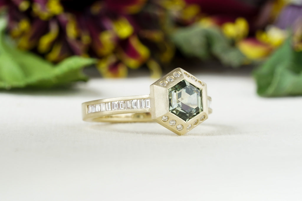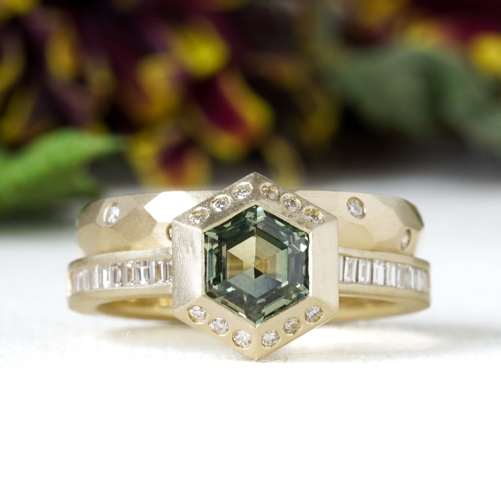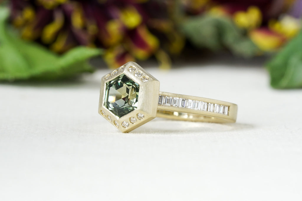 For the modern romantic who loves clean lines and thoughtful symmetry, meet our latest Artifex geometric engagement ring. A stunning green Montana hexagon sapphire is bezel-set in satin-finished 14k yellow gold with a natural diamond halo, and flanked by the subtle shimmer of channel-set natural white diamonds.
